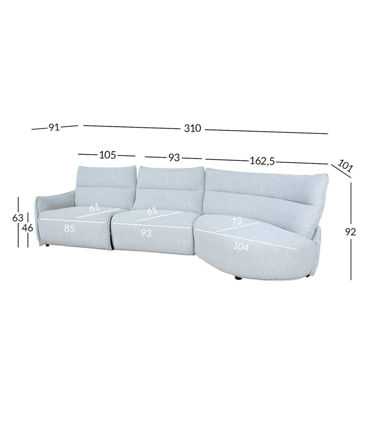 Diivani üldmõõdud on 310x91/101xH92cm.
