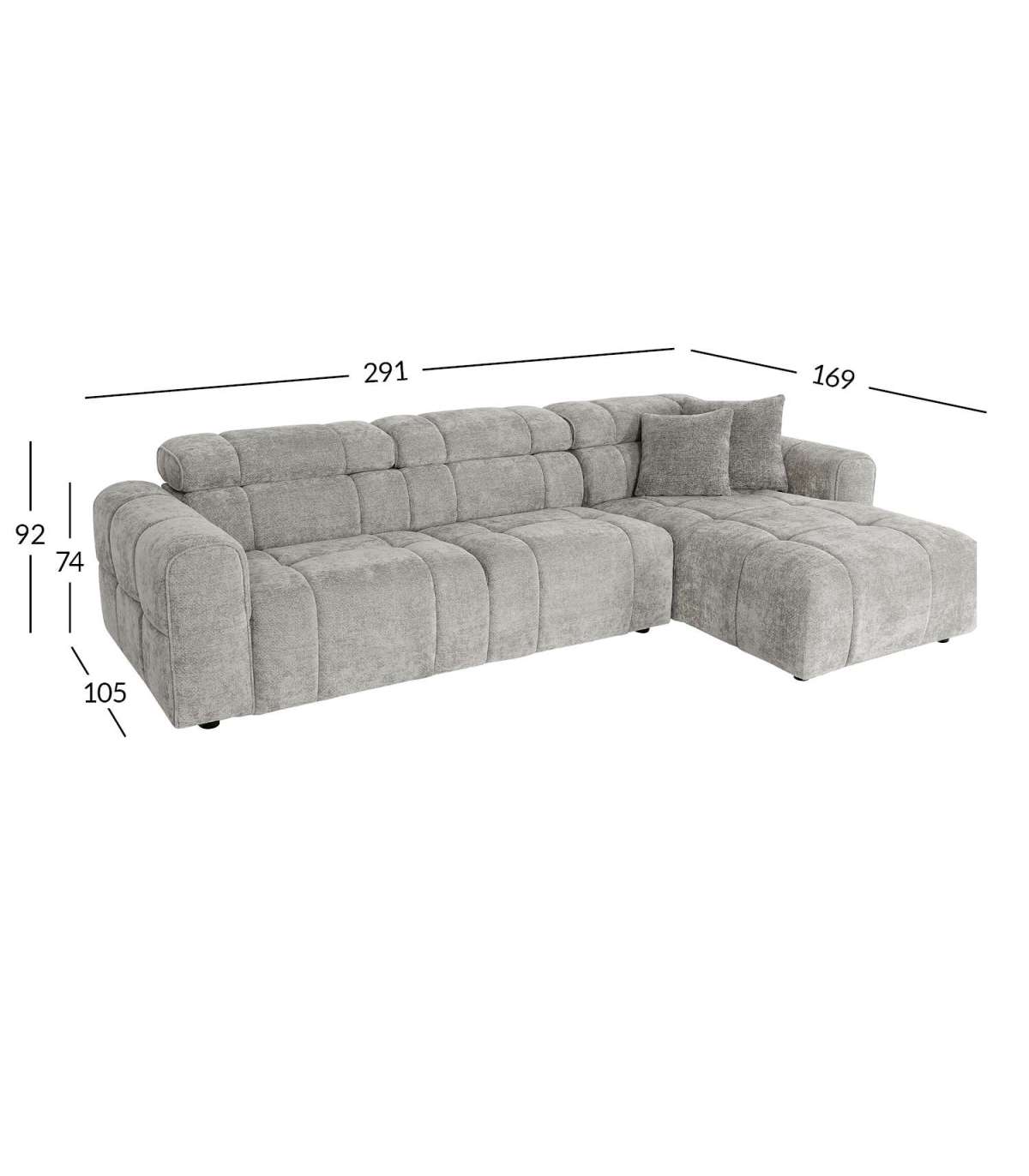Diivani üldmõõdud on 291x105/169xH74/92cm.