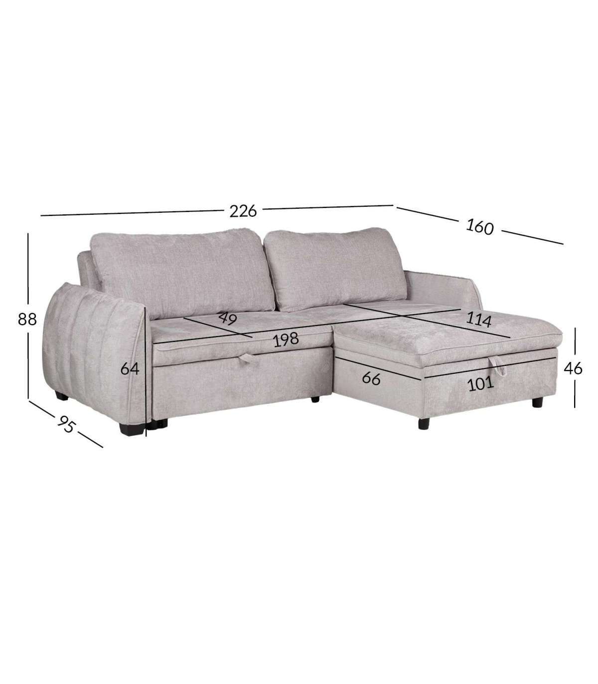 Diivani üldmõõdud: 226x95/160x88cm. Istme laius 198cm, istme sügavus 49(67)/114(132)cm. Istme kõrgus 46cm. Käetoe kõrgus maast 64cm.