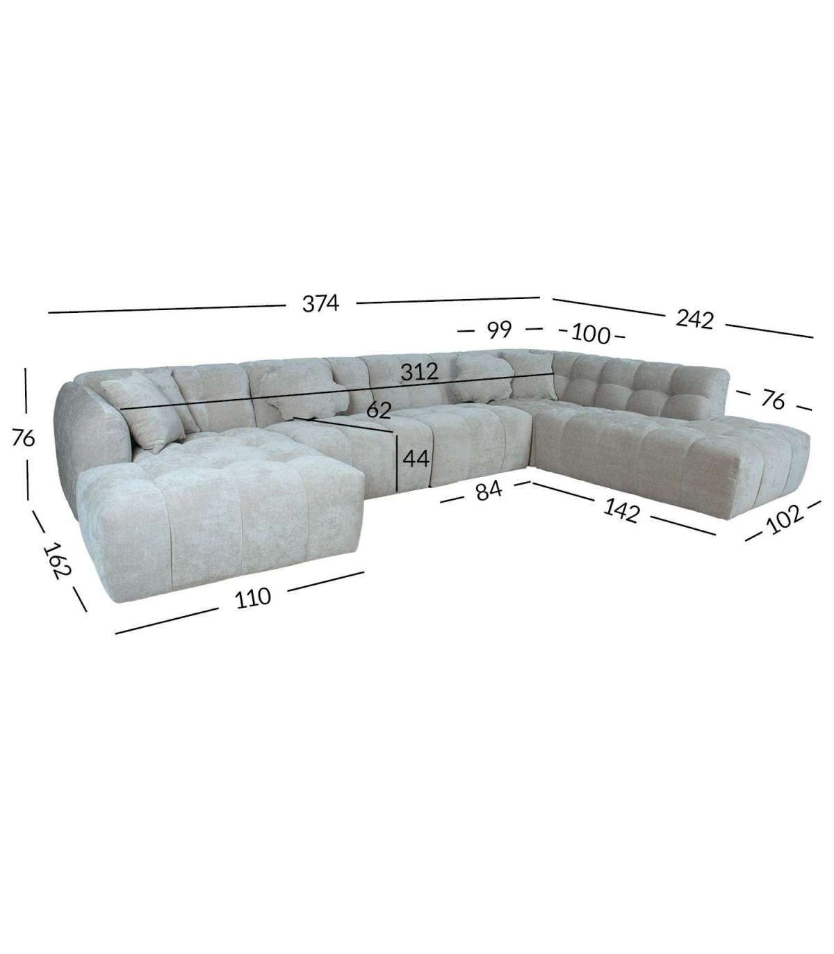 Diivani üldmõõdud on 374 x 162/242 x H76 cm.