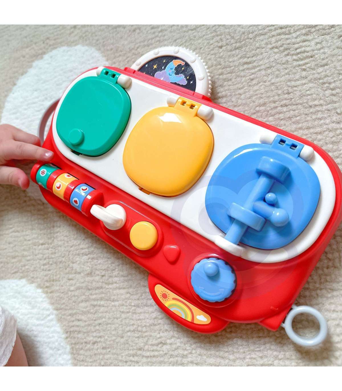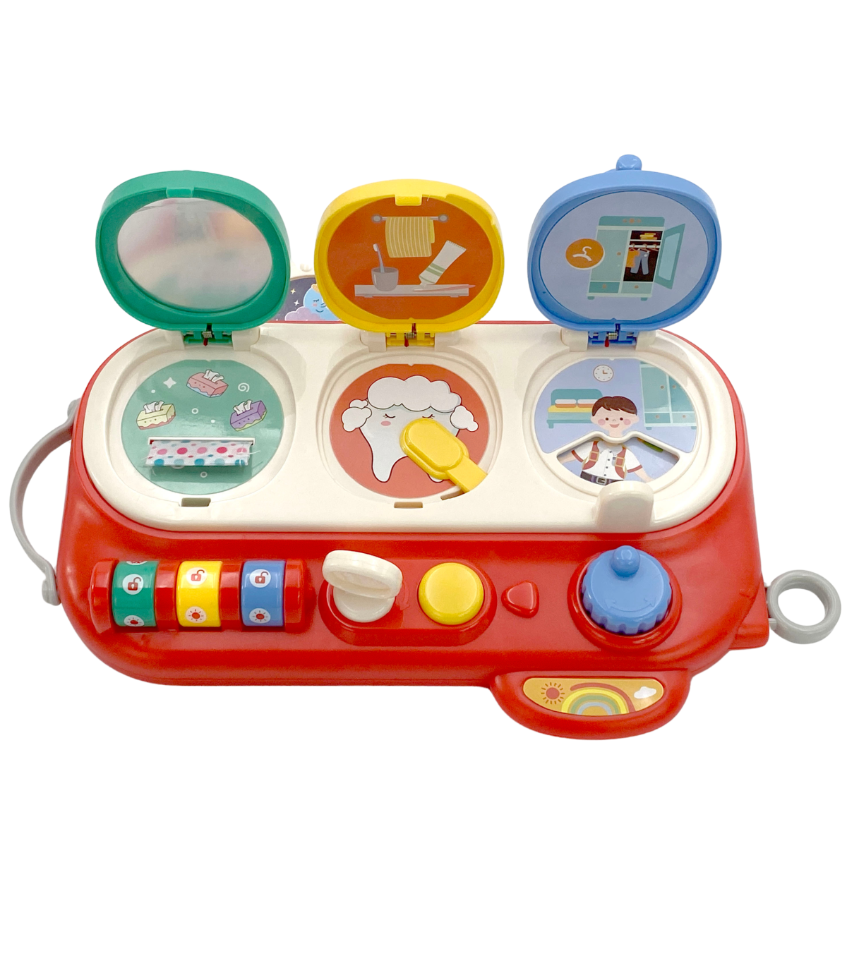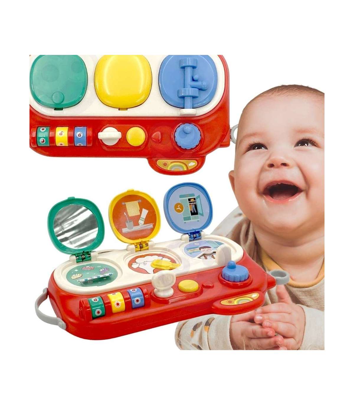 Открой и Проверь — это необычайно интересная обучающая интерактивная игрушка, которая развивает мелкую моторику, зрительные навыки и учит причинно-следственному мышлению. Три разноцветных окошка-сюрприза вовлекают ребёнка в игру и в исследование новых возможностей. Зелёное окошко открывается с помощью кода — при открытии малыш обнаруживает цветные платочки. Жёлтое окошко открывается ключиком — внутри изображение зуба и подвижная зубная щётка. Синее окошко, открываемое кнопкой и поворотным механизмом, показывает мальчика и поле с одеждой для переодевания. Благодаря разнообразным активностям ребёнок нажимает, вращает и сдвигает элементы, развивая свои ручные навыки, воображение и креативность.