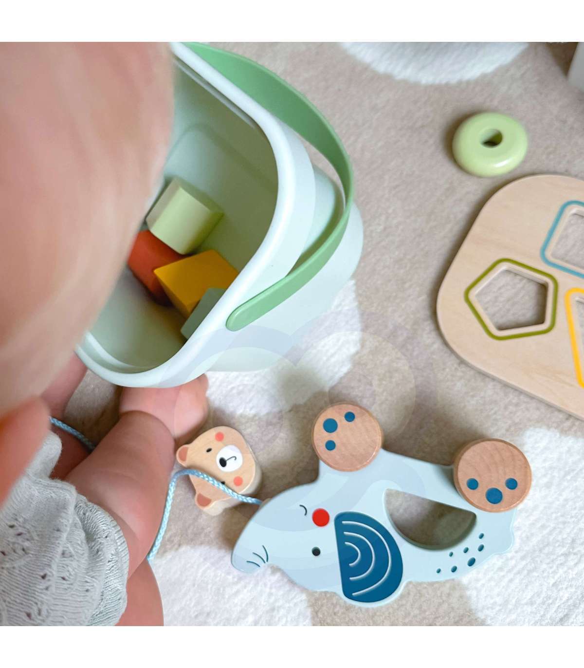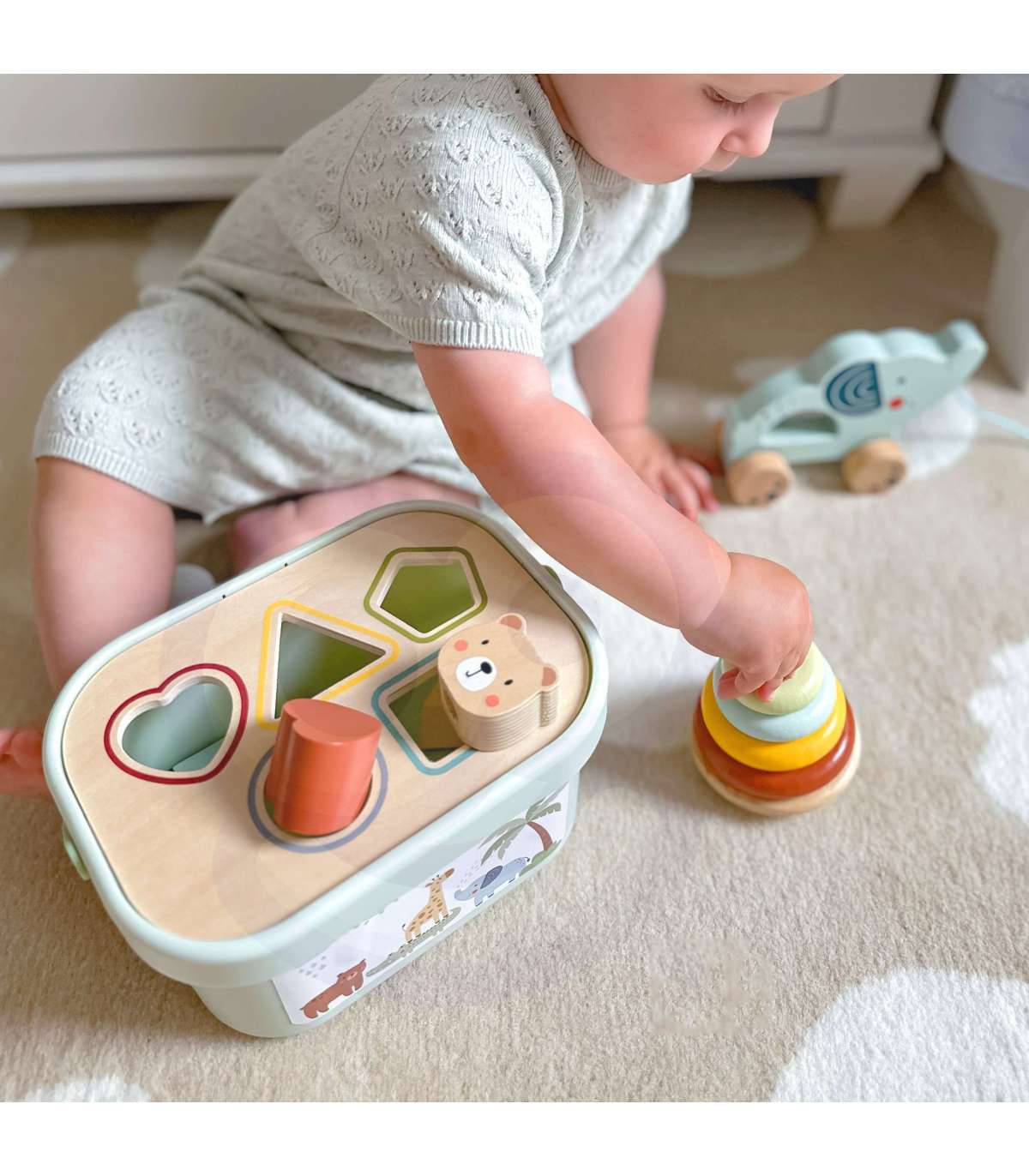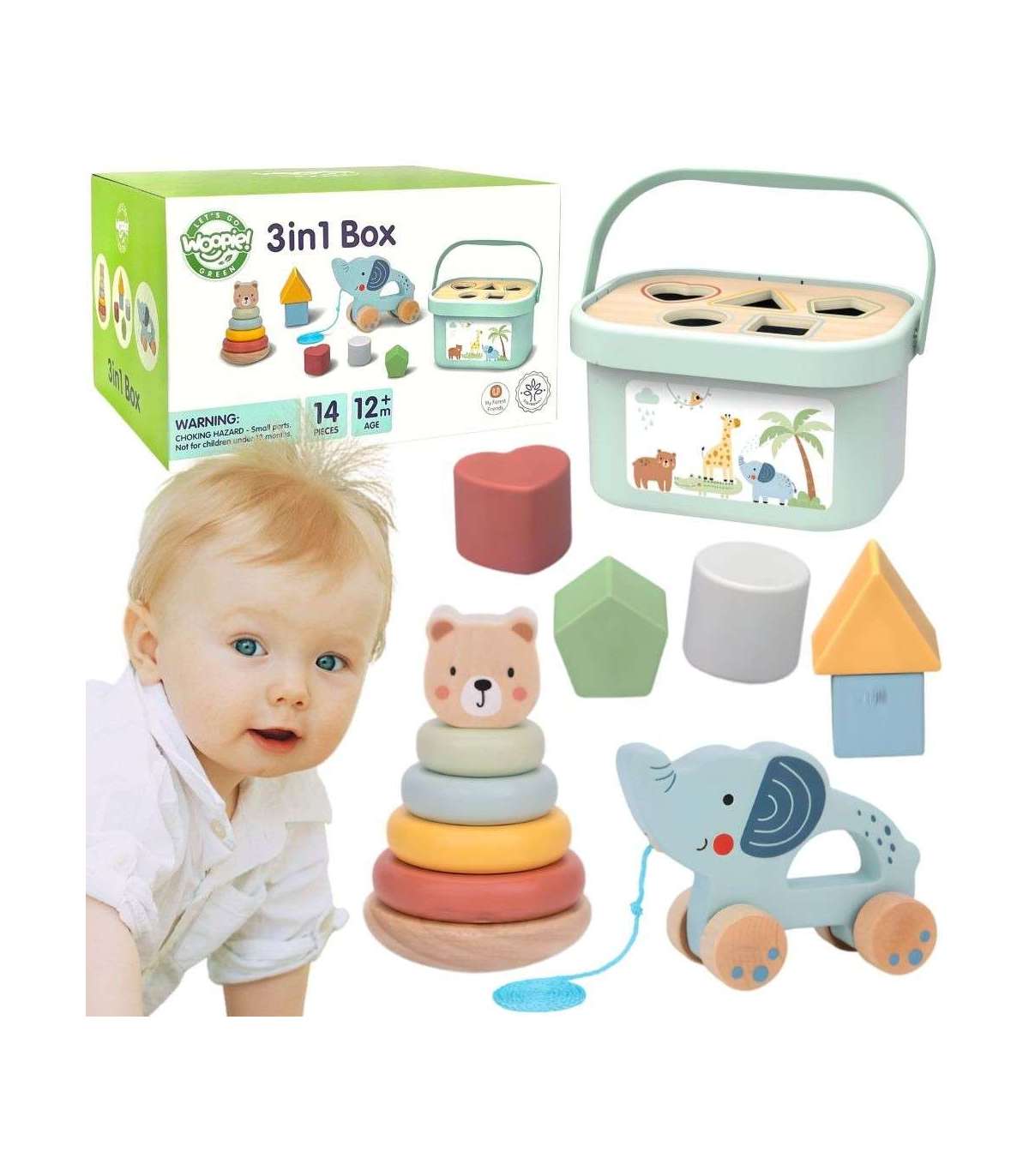 Набор 3 в 1 от WOOPIE GREEN — это классическая и универсальная развивающая игрушка, которая предлагает малышам множество форм игры и обучения. В набор входит коробка-сортер с кубиками, пирамидка-медвежонок и слоник для толкания и тянения — всё изготовлено из безопасных материалов и спроектировано для маленьких ручек. Игрушки удобно хранить в закрывающейся коробке с ручкой для переноски.