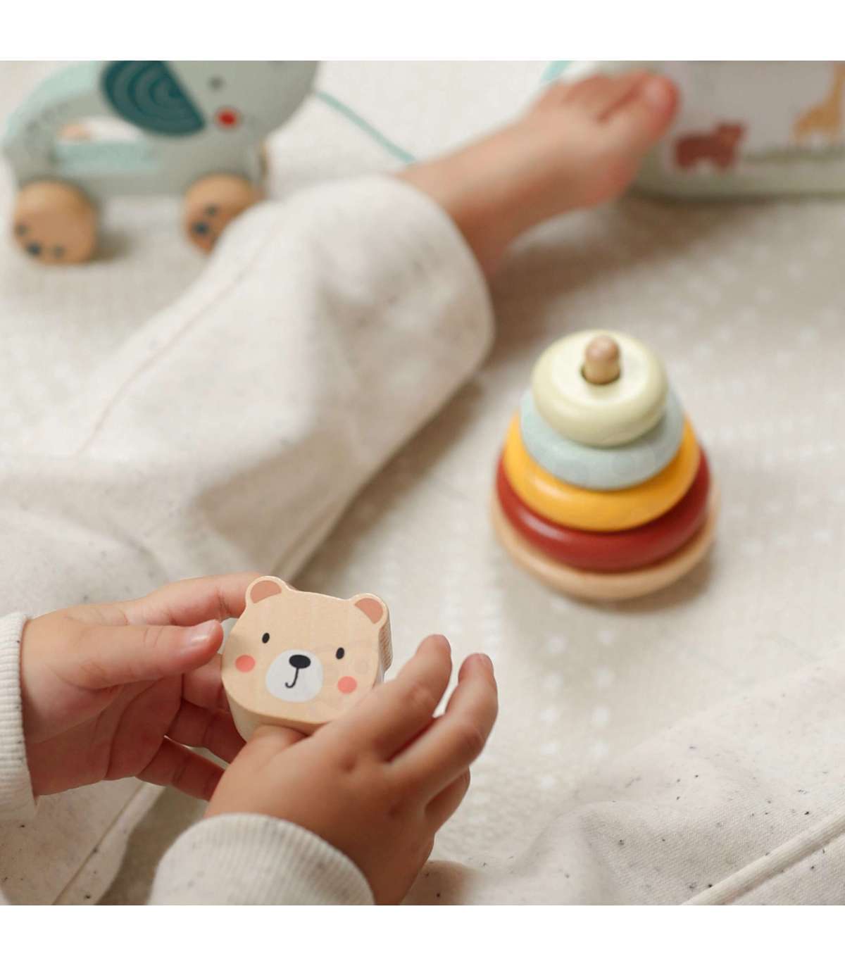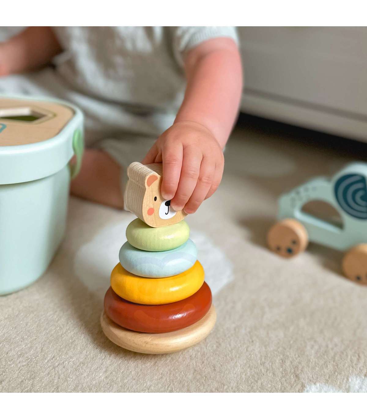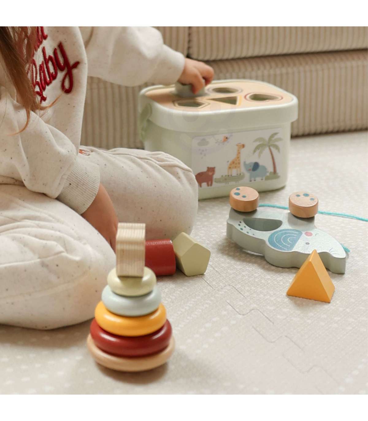 Набор 3 в 1 от WOOPIE GREEN — это классическая и универсальная развивающая игрушка, которая предлагает малышам множество форм игры и обучения. В набор входит коробка-сортер с кубиками, пирамидка-медвежонок и слоник для толкания и тянения — всё изготовлено из безопасных материалов и спроектировано для маленьких ручек. Игрушки удобно хранить в закрывающейся коробке с ручкой для переноски.