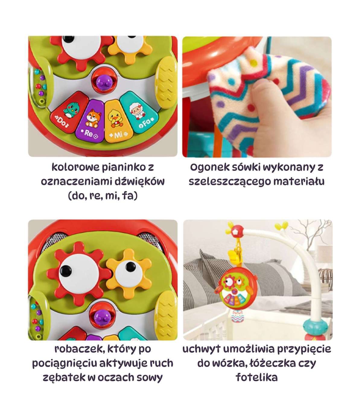 Интерактивная подвеска в форме совы от бренда WOOPIE — милая и функциональная игрушка для самых маленьких, которая сочетает в себе обучение и игру. Яркая сова спроектирована так, чтобы привлекать внимание ребенка разнообразными зрительными, тактильными и звуковыми стимулами. Крылышки совы подвижны, поэтому малыш может ими двигать во время игры. Из клюва торчит червячок, который при потягивании активирует движение шестеренок в глазах совы. На животике совы расположено цветное пианино с обозначениями звуков (до, ре, ми, фа). При нажатии клавиш ребенок услышит нежные, дружелюбные мелодии, которые способствуют развитию слуха и учат различать тона. Хвостик совы выполнен из шуршащего материала, а подвеска оснащена ручкой, что позволяет прикреплять её к коляске, кроватке или автокреслу.
