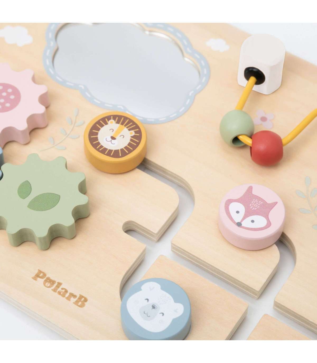Drewniana tablica manipulacyjna od marki Viga z serii PolarB to idealna zabawka edukacyjna dla najmłodszych odkrywców świata. Zawiera elementy, które przyciągają uwagę dziecka – lusterko, labirynt z koralikami, koła zębate i suwak. Każdy z nich wspiera rozwój sensoryczny i uczy koordynacji ruchowej poprzez zabawę. Dzięki pastelowym kolorom i przyjemnej w dotyku strukturze, tablica stymuluje zmysły i zachęca do eksperymentowania. To doskonały prezent, który łączy bezpieczeństwo, estetykę i funkcjonalność w jednym produkcie!