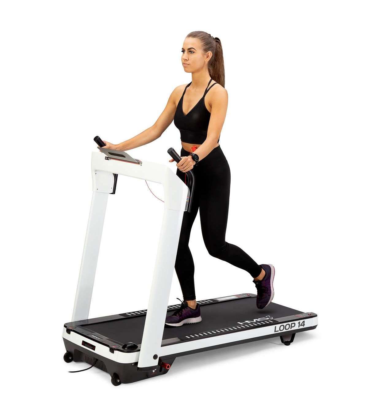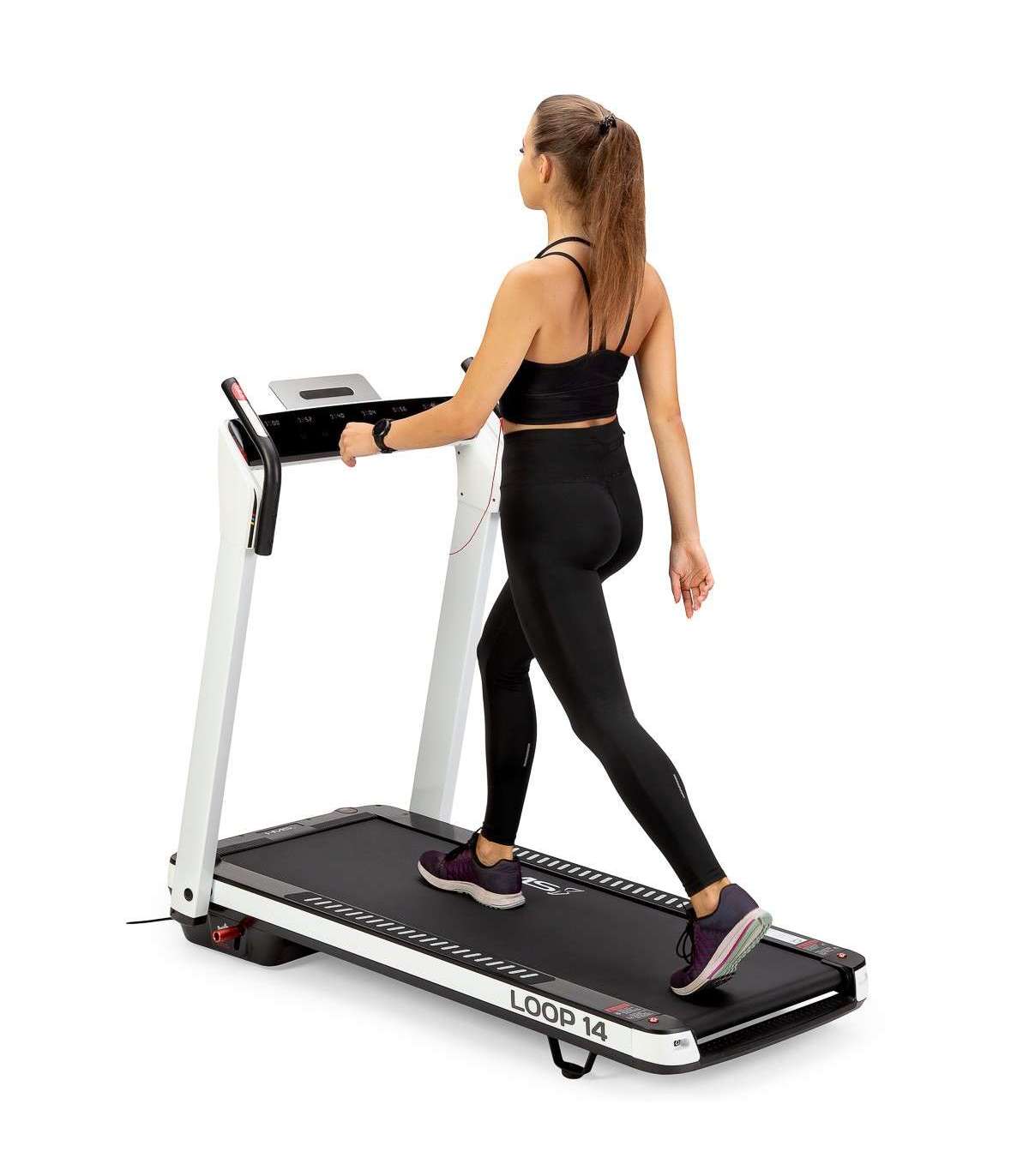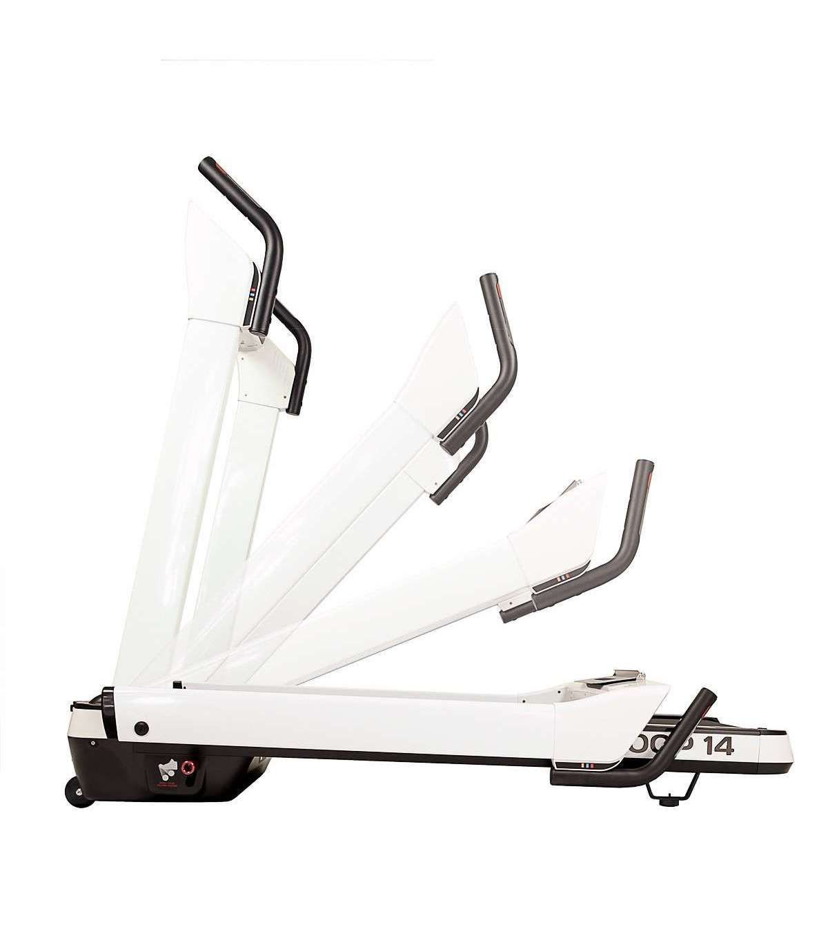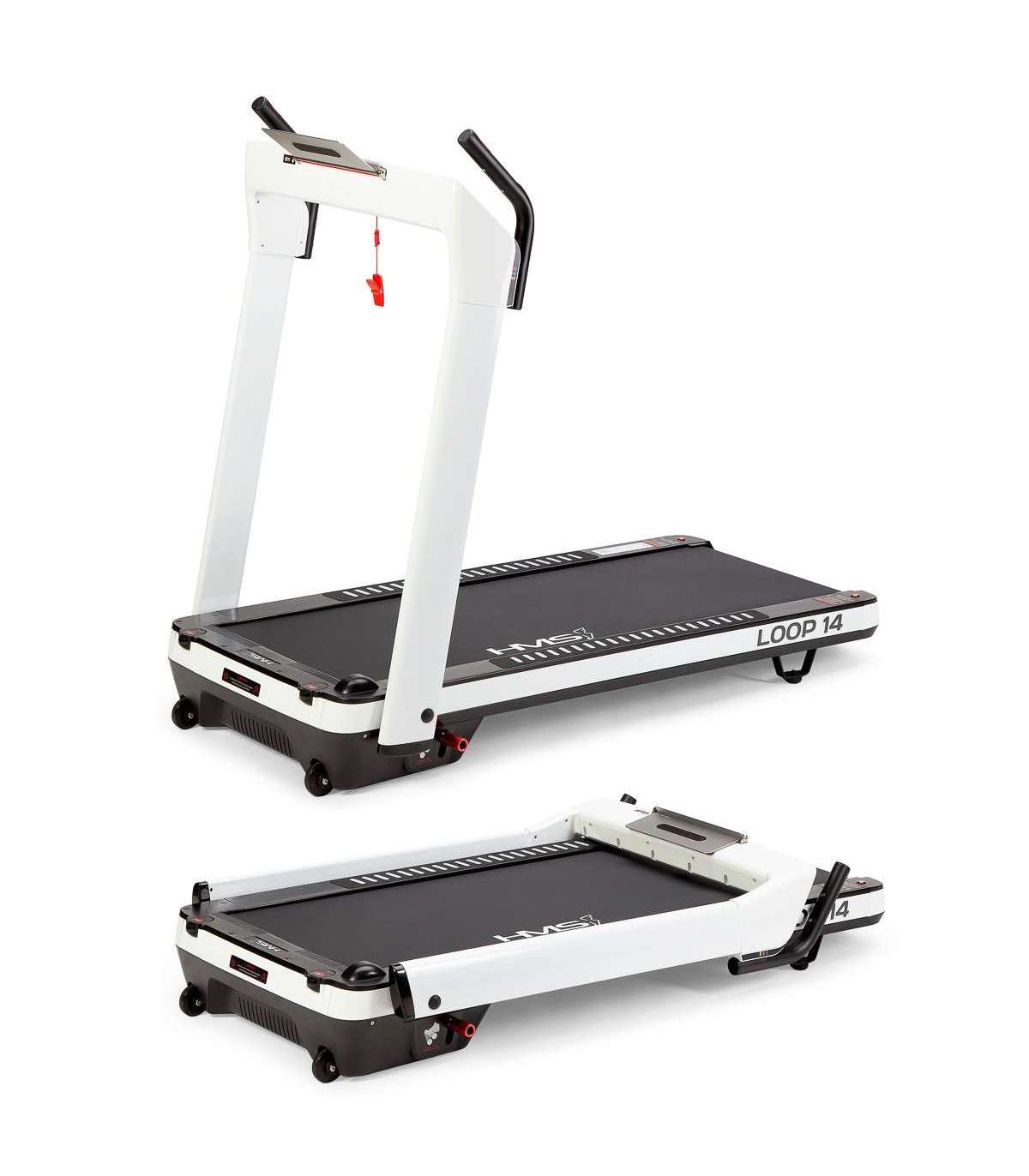 Дополнительным преимуществом беговой дорожки является её размер, так как модель LOOP14 занимает немного места благодаря складывающемуся поручню. Поручень складывается автоматически после освобождения замка и лёгкого нажатия. Механизм блокировки находится внизу беговой дорожки, так что вы можете удобно освободить замок, нажав на него ногой. Перемещение устройства также не будет проблемой: благодаря установленным транспортным колесам мы можем перемещать беговую дорожку вертикально и горизонтально без особых усилий. С этой беговой дорожкой вы можете тренироваться где и когда хотите, не беспокоясь о нехватке пространства или неудобстве transporta. LOOP14 адаптируется к вашим потребностям и условиям.