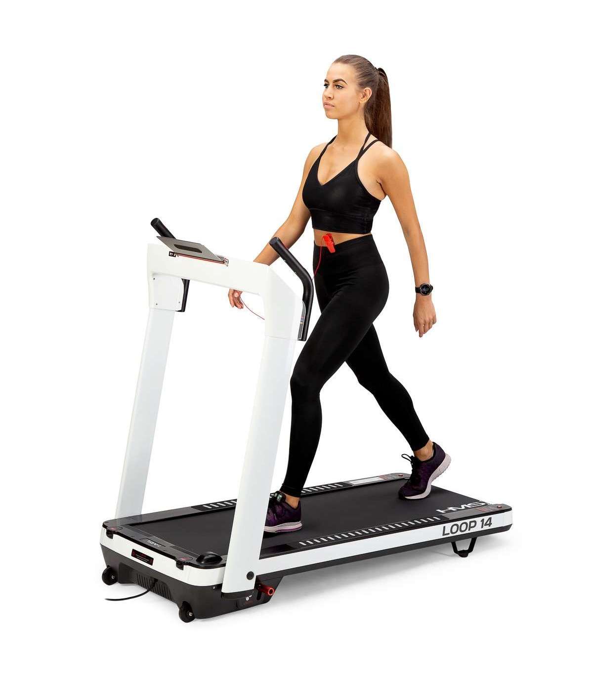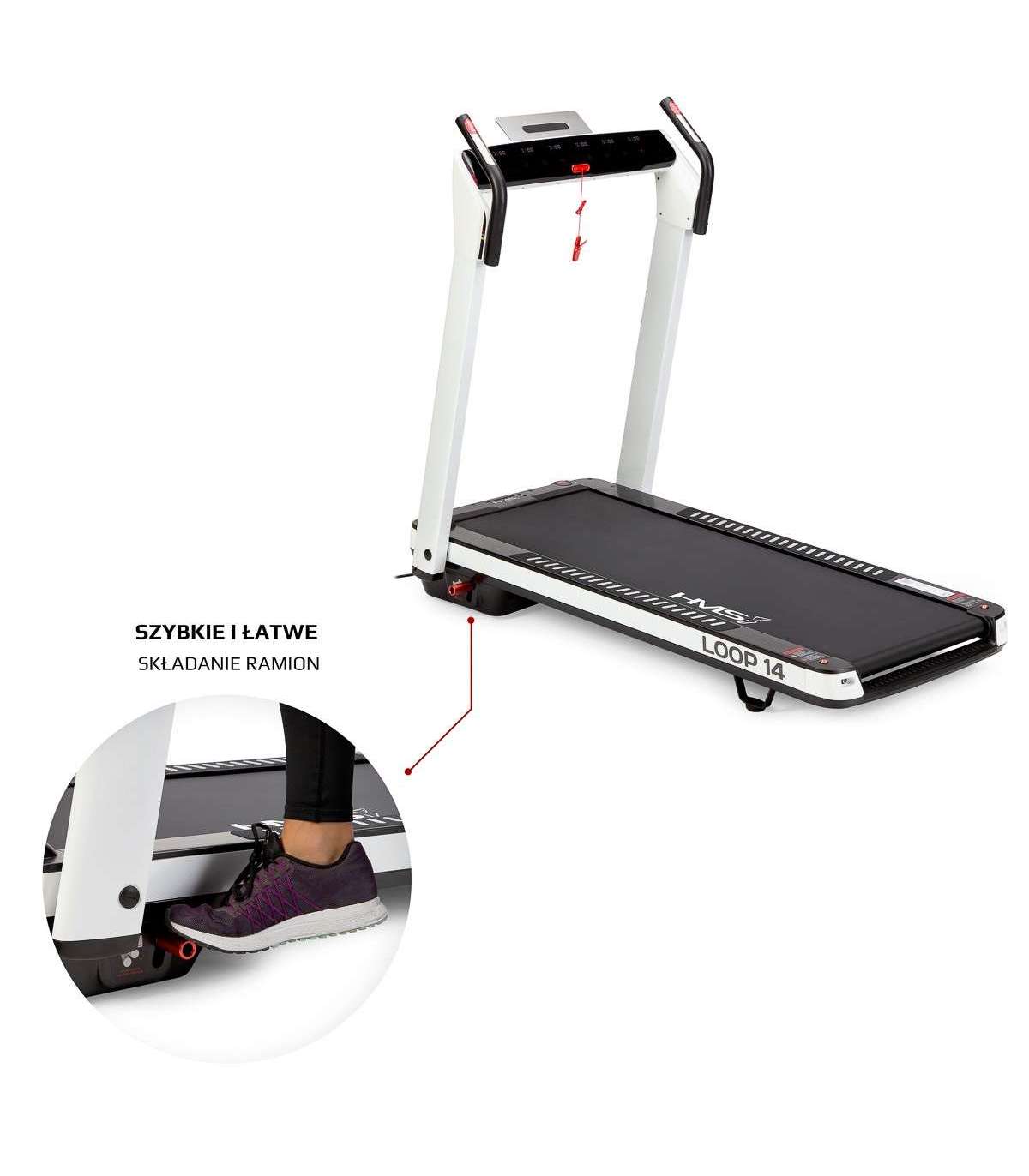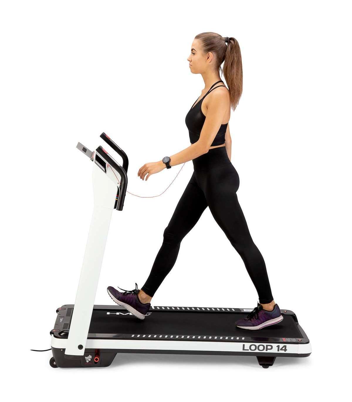 Дополнительным преимуществом беговой дорожки является её размер, так как модель LOOP14 занимает немного места благодаря складывающемуся поручню. Поручень складывается автоматически после освобождения замка и лёгкого нажатия. Механизм блокировки находится внизу беговой дорожки, так что вы можете удобно освободить замок, нажав на него ногой. Перемещение устройства также не будет проблемой: благодаря установленным транспортным колесам мы можем перемещать беговую дорожку вертикально и горизонтально без особых усилий. С этой беговой дорожкой вы можете тренироваться где и когда хотите, не беспокоясь о нехватке пространства или неудобстве transporta. LOOP14 адаптируется к вашим потребностям и условиям.
