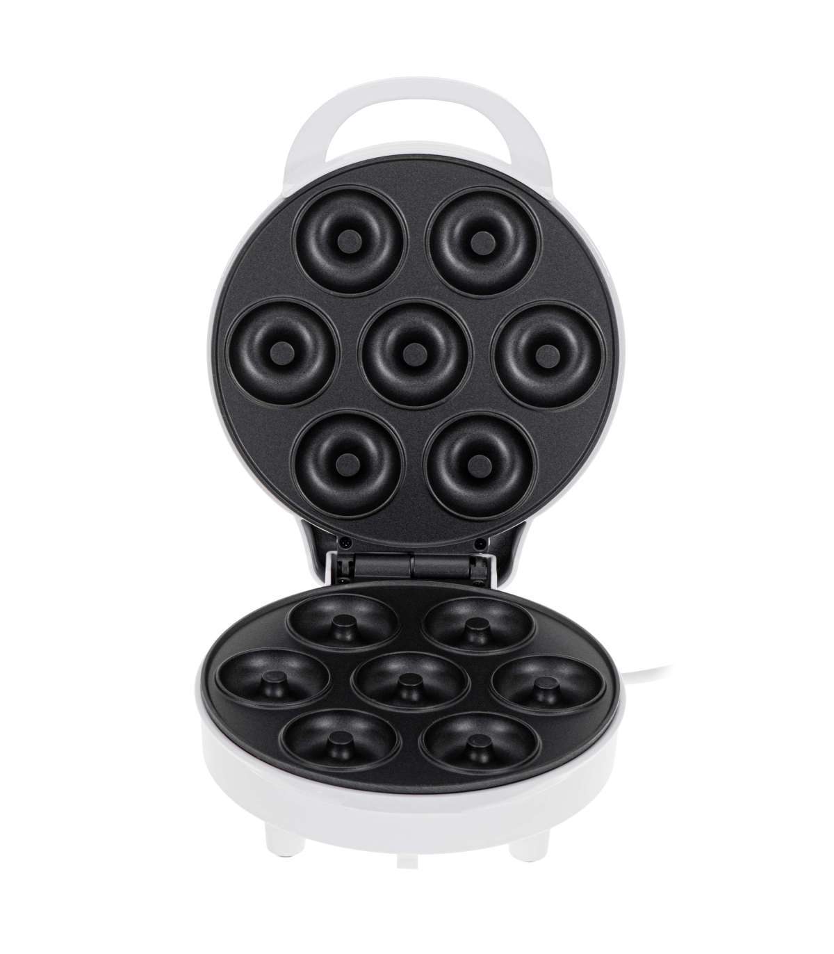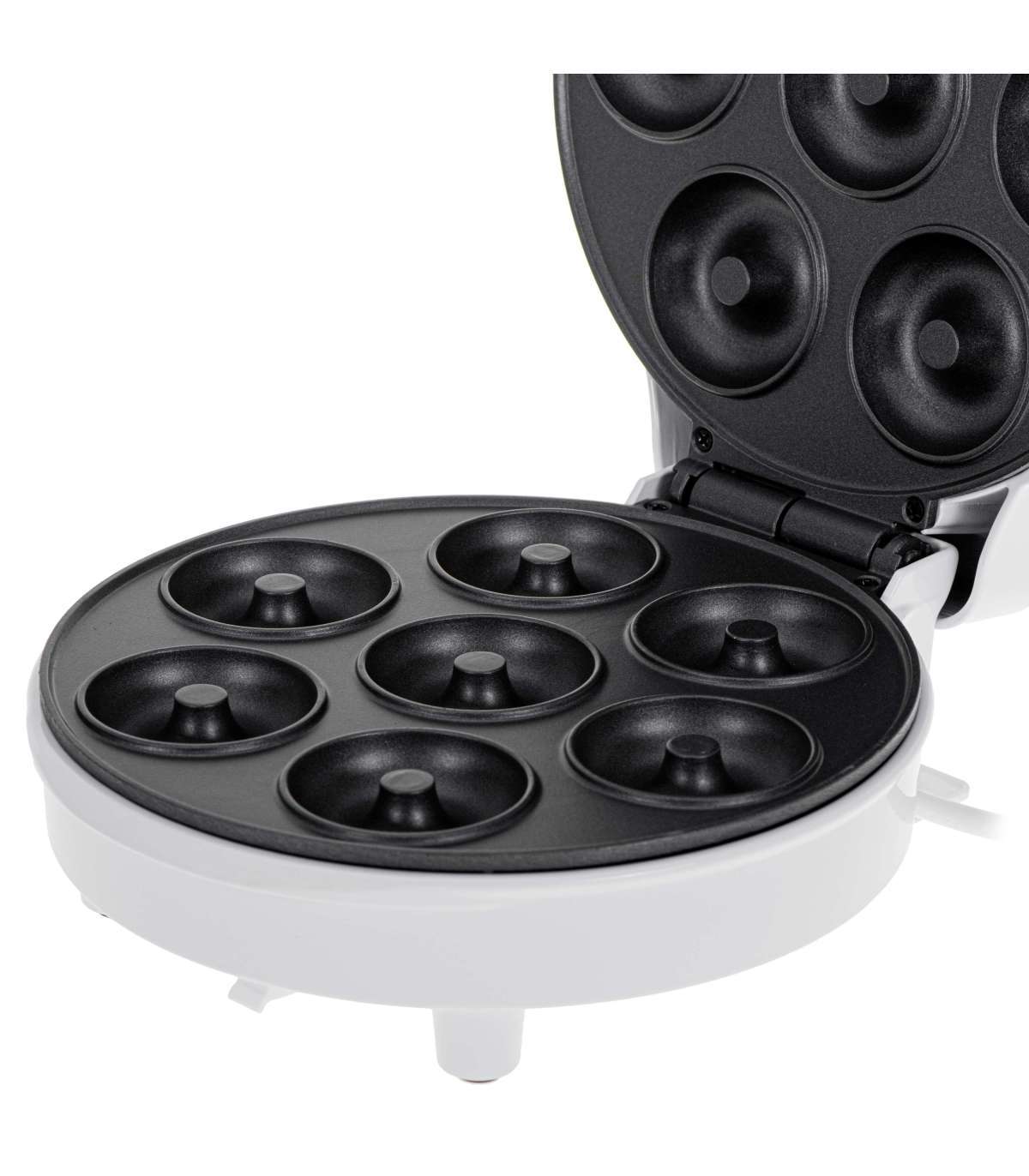 - Bakes 7 donuts at one time; Non-stick heating plates; Cool touch handle; 2 control lights for power and baking