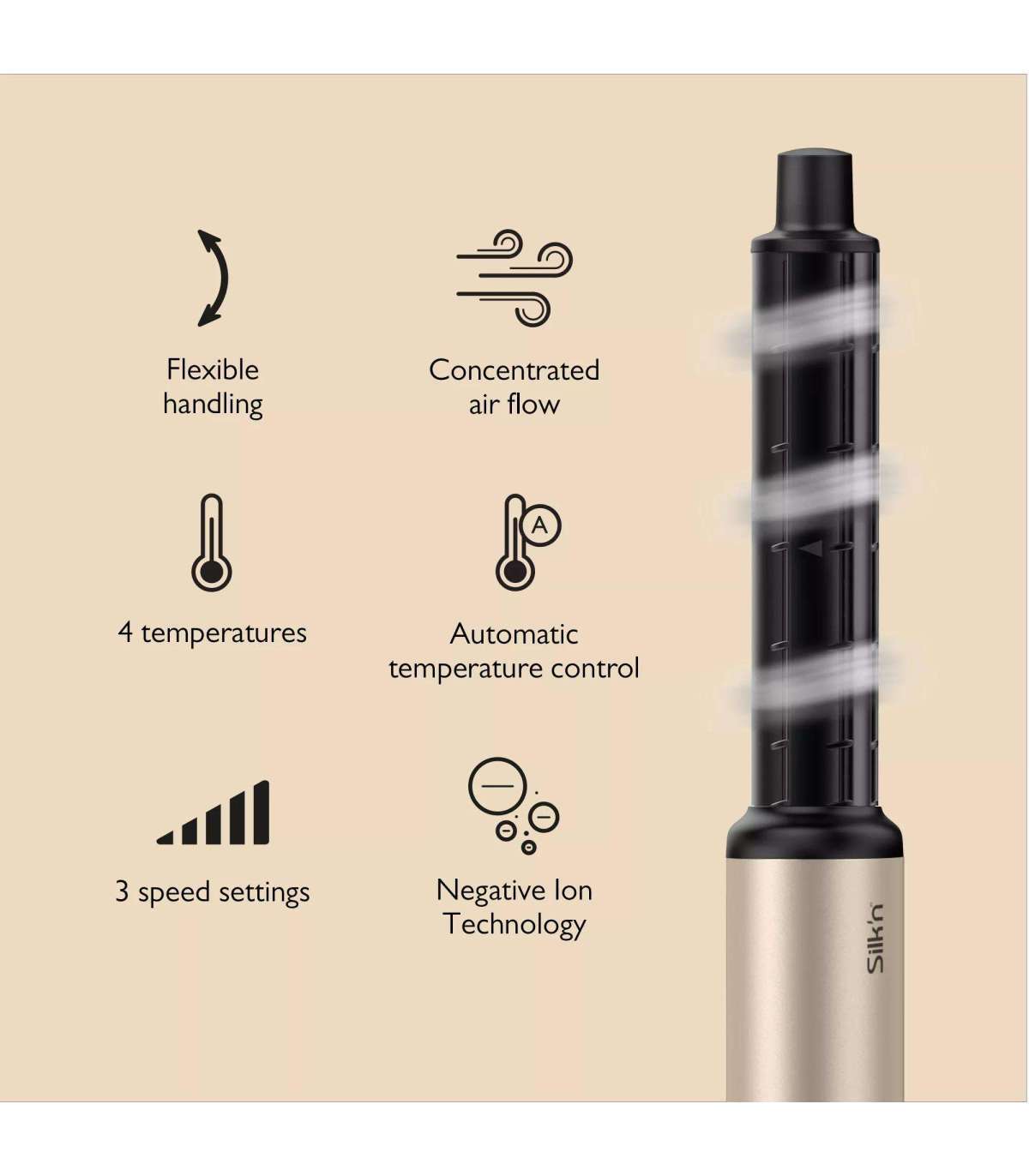 Pakendi sisu: 1x SilkyAir Flex seade, 1x parempoolne automaatse mähisega silinder, 1x vasakpoolne automaatse mähisega silinder, 1x kontsentraator, 1x ovaalne hari, 1x aeruhari, 1x hoiukohver, 1x kasutusjuhend