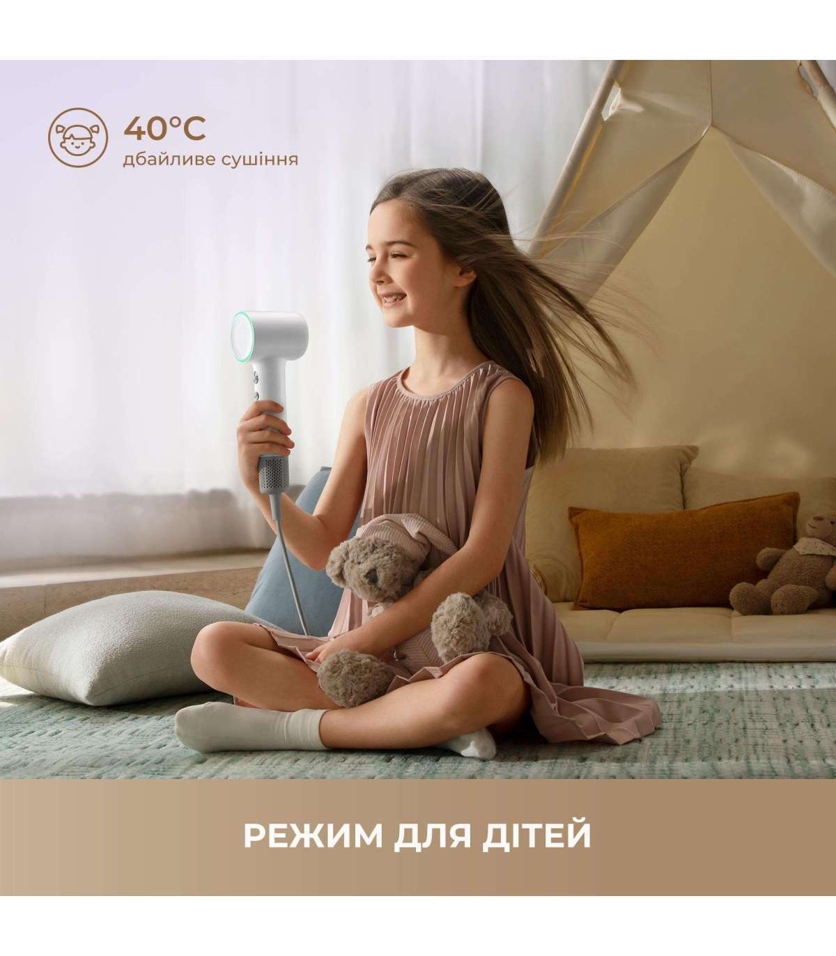 The Dreame Hair MINI high-speed hair dryer combines powerful performance and a compact design for easy hair styling at home or on the go. It has a gentle temperature control to protect the scalp and an ionizer that smoothes hair and gives it shine. Thanks to effective drying and a child mode with a controlled temperature of 40 degrees, using the hair dryer is convenient and safe.