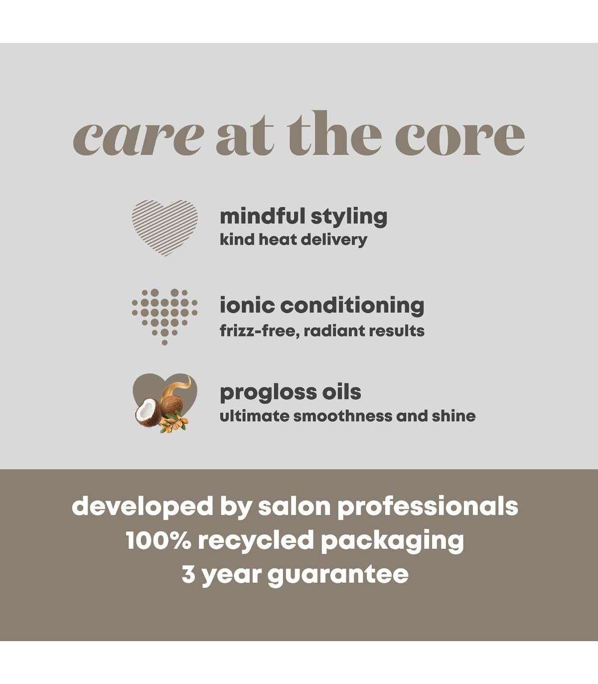 Передовая технология: керамические стволы и щетки, наполненные кератином Progloss™, аргановым и кокосовым маслом, для гладких и блестящих результатов.