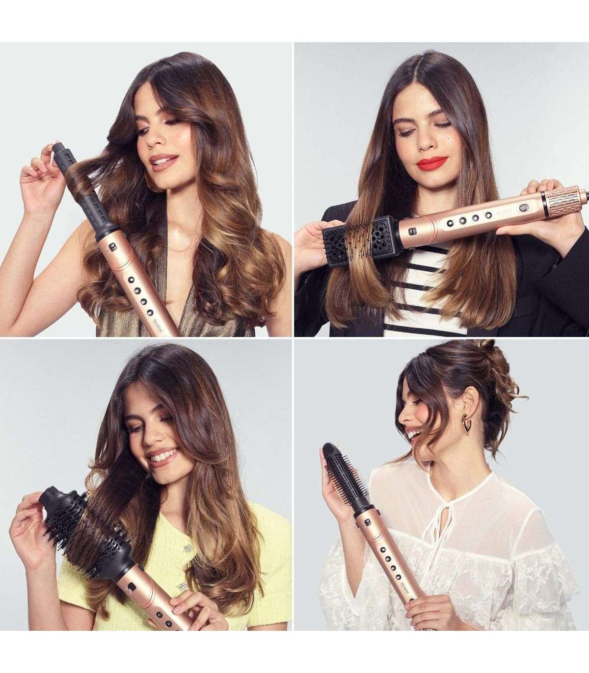 6 насадок для укладки: в комплект входит овальная щетка для придания объема и насадки для создания упругих локонов.