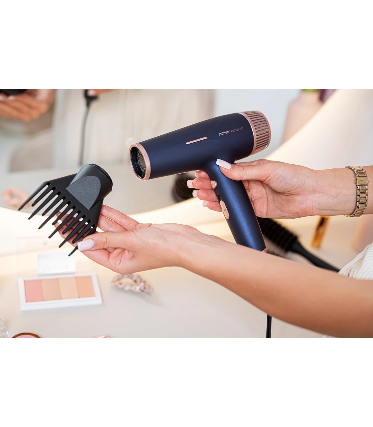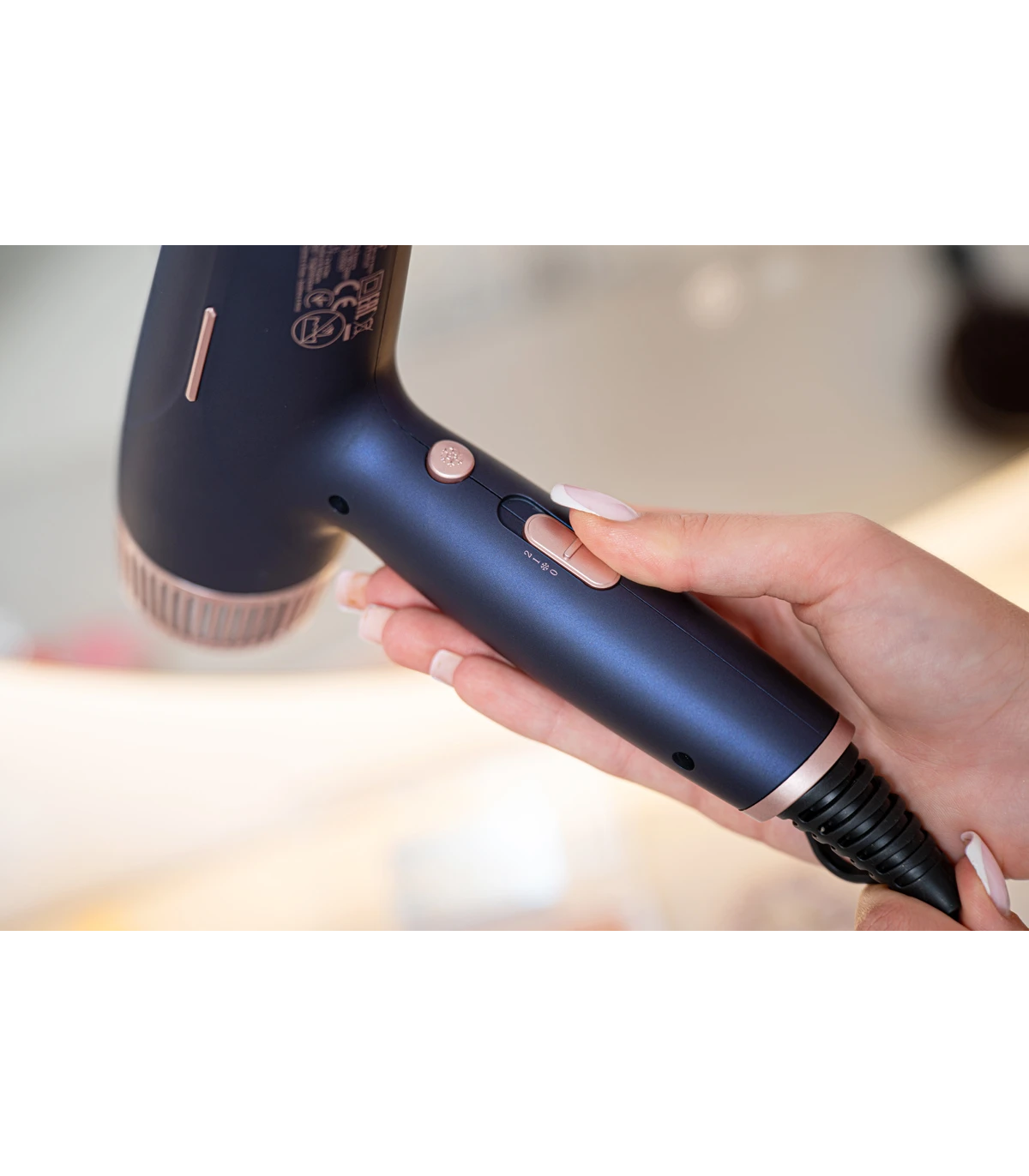 Мощность 1800-2200 Вт в сочетании с 2 скоростными режимами и 3 уровнями температуры гарантирует быструю и тщательную сушку, адаптированную к потребностям каждого типа волос.
