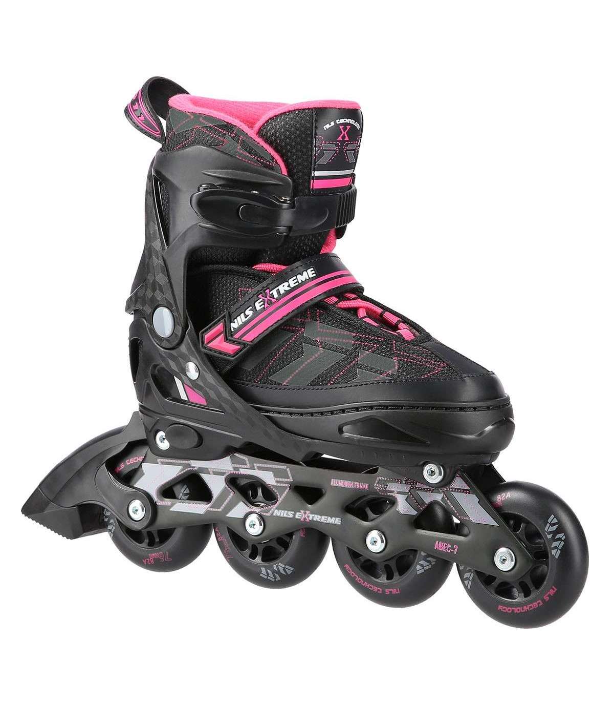 NA11002 Nils Extreme is a model of roller skates designed for beginners and intermediate enthusiasts of skating. It is a combination of interesting design and the highest quality materials ensuring high comfort of use.The boot is made of a synthetic leather, the velvet material, the MESH and the high density foam. This composition makes skating extremely comfortable. Moreover, the boot is ventilated. ABEC7 class bearings provide high quality traction.Soft wheels ensure good adhesion to the ground and they absorb all vibrations very well. The boot is equipped with a two-section buckle, Velcro and laces to ensure maximum safety while skating, and the brake made of the highest quality impact-resistant PP ensuring safe stop even at relatively high speeds.The size adjustment system makes it easy to adjust the size to a user's foot quickly, making that skates can be used many seasons!Specification:Skid: aluminumBearings: ABEC7Boot: semi-soft, with a vent systemShell: PPMaterial:VelvetMeshSynthetic leatherHigh density foamWheels:PU70 mm/82A (S 31-34)PU76 mm/82A (M 35-38)PU80 mm/82A (L 39-42)Snap:Two-section snap fastenerHooks and loopsLacingInner shoe length: 210-235 mmBrake: Impact-resistant PPRemarks:Not for the commercial use24 months warrantyImporter: Abisal Ltd. | Poland | 41-807 Zabrze | Pyskowicka Street 17 | e-mail: abisal@abisal.plAbisal Ltd.. declares that the products sold by the company are safe and meet the requirements contained in the Act on General Product Safety of December 12, 2003. (Journal of Laws of December 31, 2003)