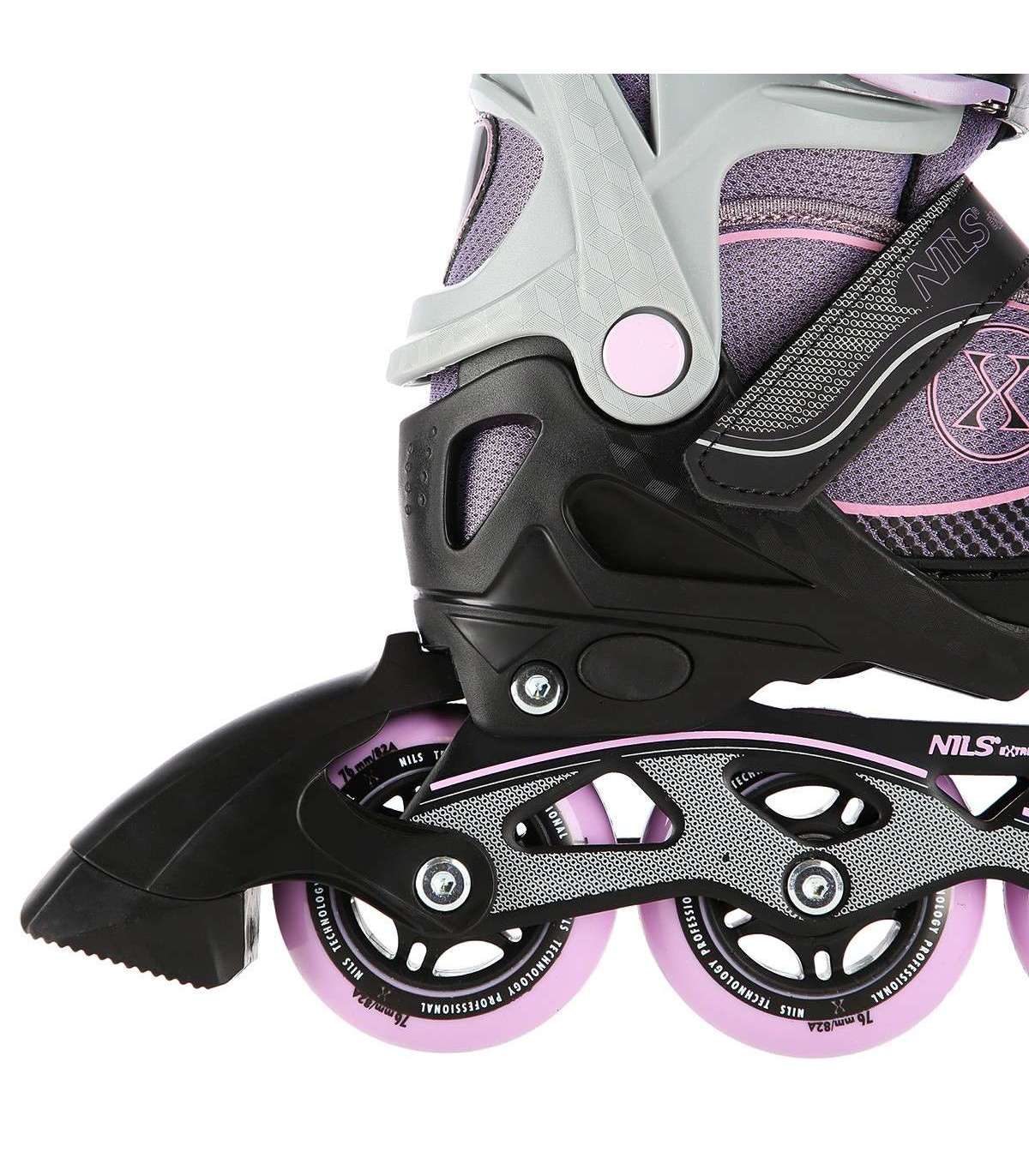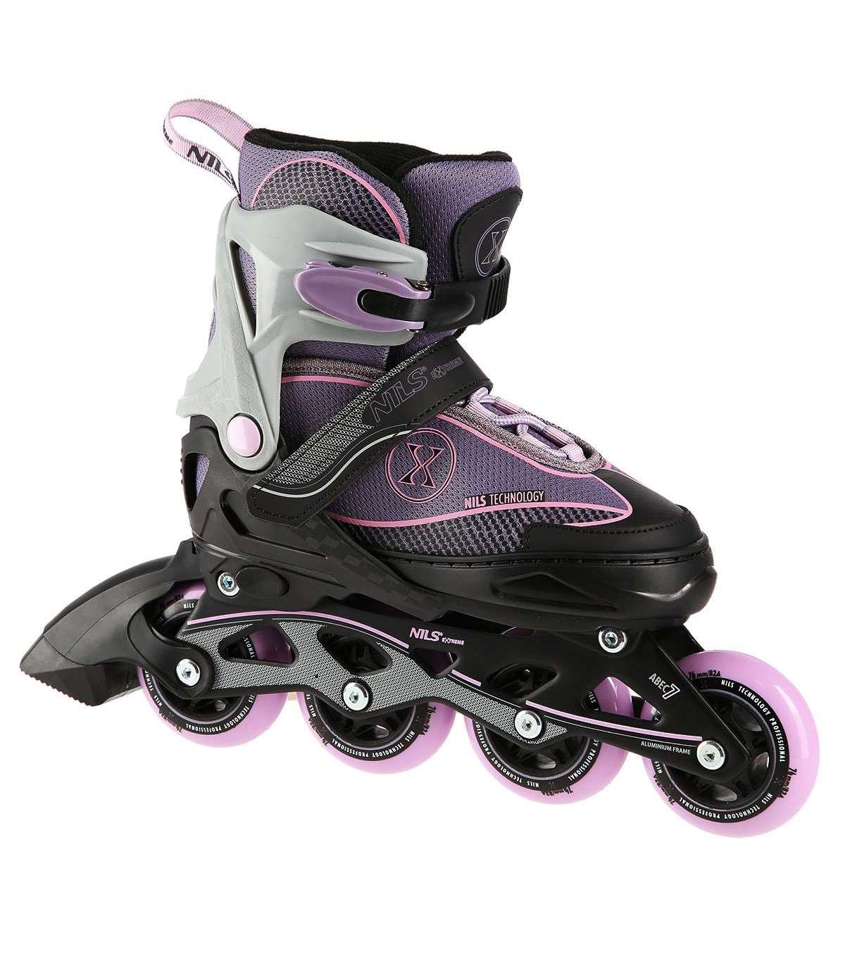 NA11008 Nils Extreme is a model of inline skates designed for beginners and intermediate skaters. It is a combination of interesting design with the highest quality materials that guarantee very high comfort of use.High qualityThe shoe is made of synthetic leather, EVA and velvet material, MESH mesh and high-density foam. Thanks to this, the ride will be extremely comfortable. In addition, it has a breathable membrane and is ventilated.Solid constructionThe inline skate is very light thanks to the aluminum skid and the base of the shoe, which is made of high quality PP. In addition, soft wheels guarantee good adhesion to the ground and absorb all vibrations well, while ABEC7 class bearings ensure high quality traction.SecurityFastening the shoe with a two-section buckle, Velcro and laces ensures maximum safety while driving, while the brake made of the highest quality impact-resistant PP will ensure safe stopping, even at relatively high speeds.AdjustableInline skates have the ability to adjust the size of the shoe to the user's foot in 4 levels, thanks to which they will be used for many seasons!Specification:Inline Skate: AluminumBearings: ABEC7Shoe: semi-soft with ventilation systemMaterial:VelvetMeshEVASynthetic leatherHigh-density foamBreathable membraneWheels:PU 80mm/82A (L 39-42)Clasp:Two-section buckleVelcro strapLacingInner shoe length: 230-255 mmBrake: Impact resistant PPRemarks:Not for commercial use24 months warrantyImporter: Abisal Ltd. | Poland | 41-807 Zabrze | Pyskowicka Street 17 | e-mail: abisal@abisal.plAbisal Ltd.. declares that the products sold by the company are safe and meet the requirements contained in the Act on General Product Safety of December 12, 2003. (Journal of Laws of December 31, 2003)