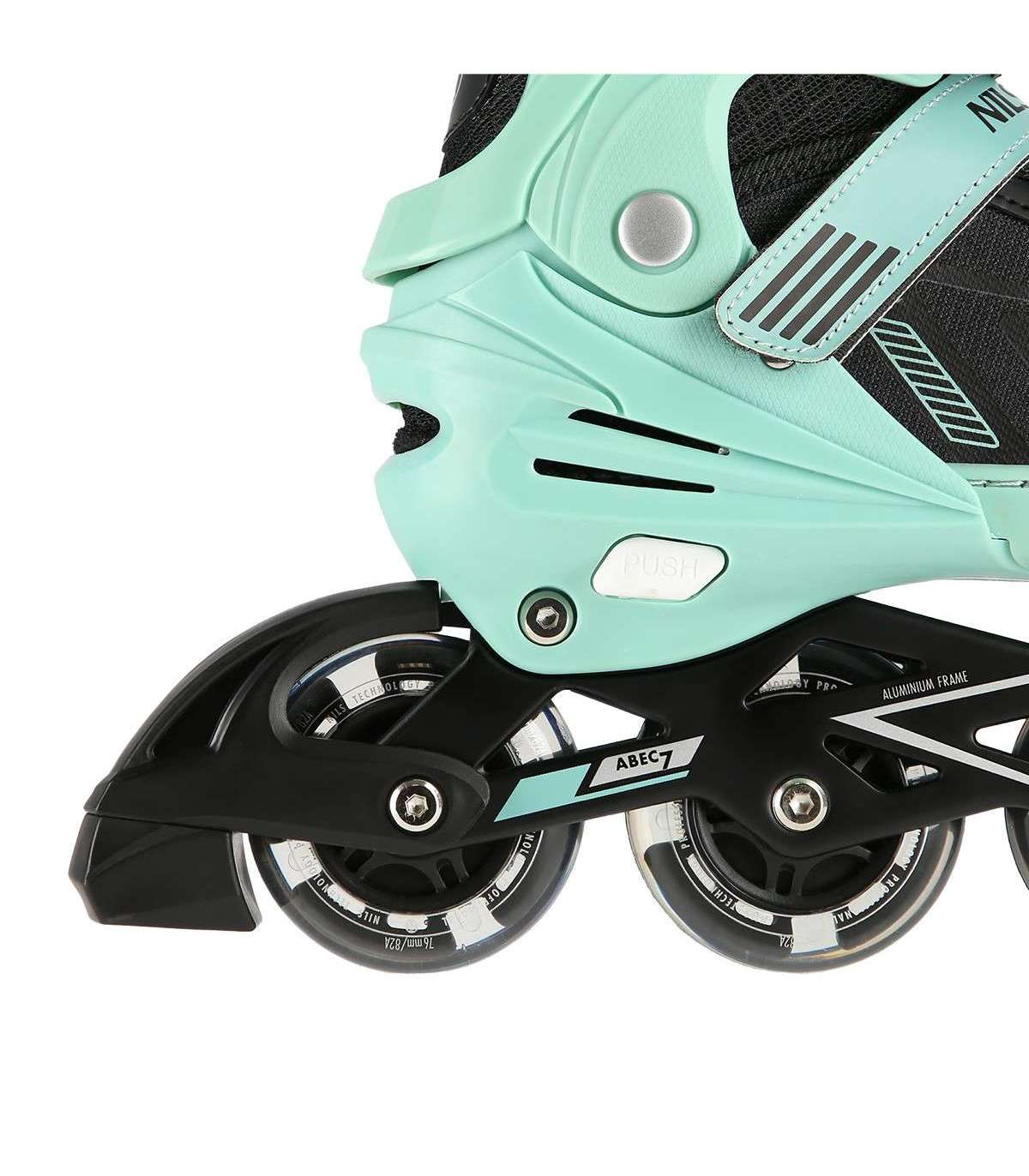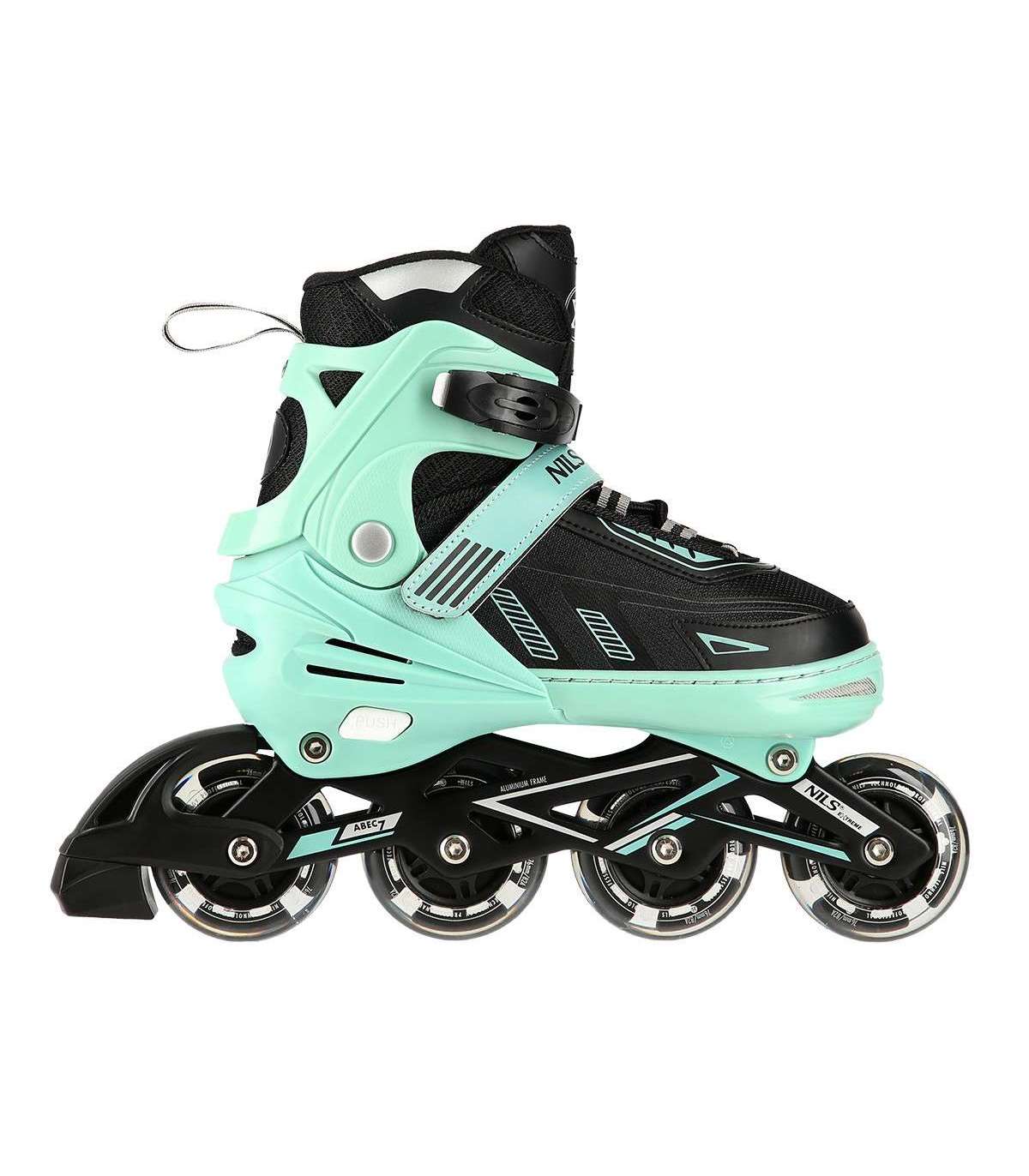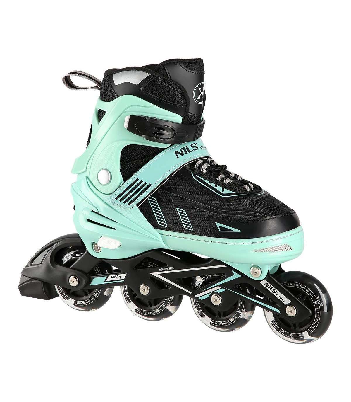 NA11230A Nils Extreme is a model of inline skates designed for beginners and intermediate skaters. It is a combination of interesting design with the highest quality materials that guarantee very high comfort of use.High qualityThe shoe is made of synthetic leather, EVA and velvet material, MESH mesh and high-density foam. Thanks to this, the ride will be extremely comfortable. In addition, it has a breathable membrane and is ventilated.Solid constructionThe inline skate is very light thanks to the aluminum skid and the base of the shoe, which is made of high quality PP. In addition, soft wheels guarantee good adhesion to the ground and absorb all vibrations well, while ABEC7 class bearings ensure high quality traction.SecurityFastening the shoe with a two-section buckle, Velcro and laces ensures maximum safety while driving, while the brake made of the highest quality impact-resistant PP will ensure safe stopping, even at relatively high speeds.AdjustableInline skates have the ability to adjust the size of the shoe to the user's foot in 4 levels, thanks to which they will be used for many seasons!Specification:Inline Skate: AluminumBearings: ABEC7Shoe: semi-soft with ventilation systemMaterial:MeshEVASynthetic leatherHigh-density foamBreathable membraneWheels:PU 76mm/82A (L 39-42), LEDClasp:Two-section buckleVelcro strapLacingInner shoe length: 240-260 mmBrake: Impact resistant PPRemarks:Not for commercial use24 months warrantyImporter: Abisal Ltd. | Poland | 41-807 Zabrze | Pyskowicka Street 17 | e-mail: abisal@abisal.plAbisal Ltd.. declares that the products sold by the company are safe and meet the requirements contained in the Act on General Product Safety of December 12, 2003. (Journal of Laws of December 31, 2003)