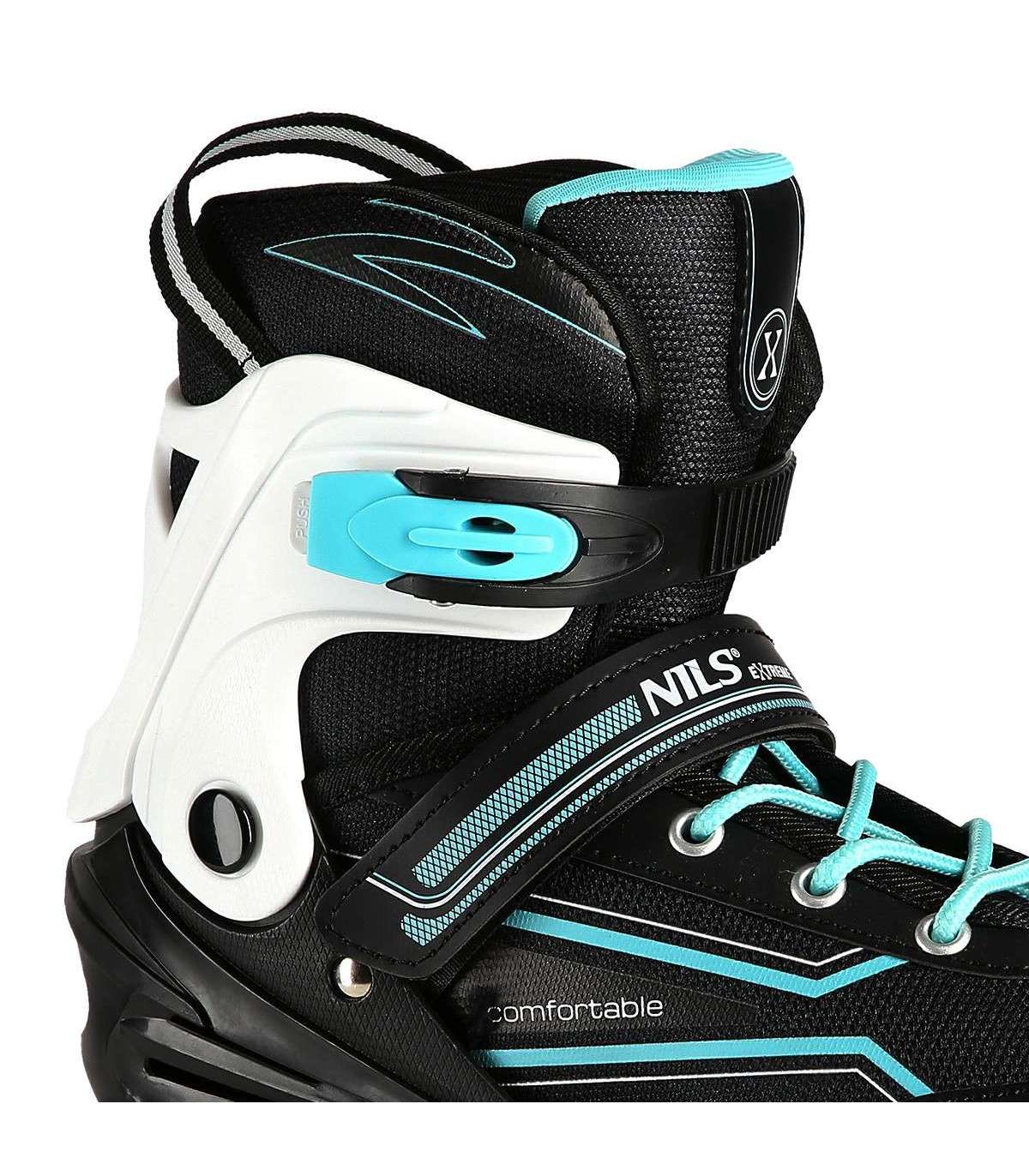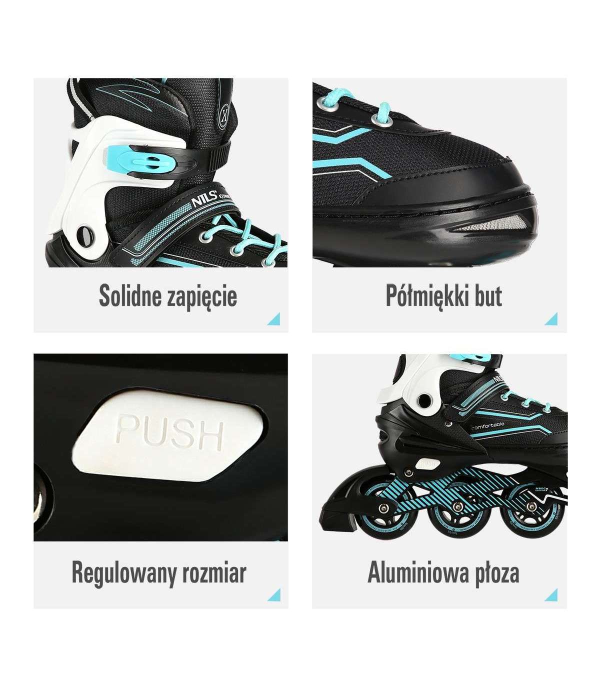 NA1169A Nils Extreme is a model of inline skates designed for beginners and intermediate skaters. It is a combination of interesting design with the highest quality materials that guarantee very high comfort of use.High qualityThe shoe is made of synthetic leather, EVA material, MESH mesh and high-density foam. Thanks to this, the ride will be extremely comfortable. In addition, it has a breathable membrane and is ventilated.Solid constructionThe inline skate is very light thanks to the aluminum skid and the base of the shoe, which is made of high quality PP. In addition, soft wheels guarantee good adhesion to the ground and absorb all vibrations well, while ABEC7 class bearings ensure high quality traction.SecurityFastening the shoe with a two-section buckle, Velcro and laces ensures maximum safety while driving, while the brake made of the highest quality impact-resistant PP will ensure safe stopping, even at relatively high speeds.AdjustableInline skates have the ability to adjust the size of the shoe to the user's foot in 4 levels, thanks to which they will be used for many seasons!Specification:Inline Skate: AluminumBearings: ABEC7Shoe: semi-soft with ventilation systemMaterial:MeshEVASynthetic leatherHigh-density foamBreathable membraneWheels:PU 72mm/82A (L 35-38)Clasp:Two-section buckleVelcro strapLacingInner shoe length: 210-230 mmBrake: Impact resistant PPRemarks:Not for commercial use24 months warrantyImporter: Abisal Ltd. | Poland | 41-807 Zabrze | Pyskowicka Street 17 | e-mail: abisal@abisal.plAbisal Ltd.. declares that the products sold by the company are safe and meet the requirements contained in the Act on General Product Safety of December 12, 2003. (Journal of Laws of December 31, 2003)