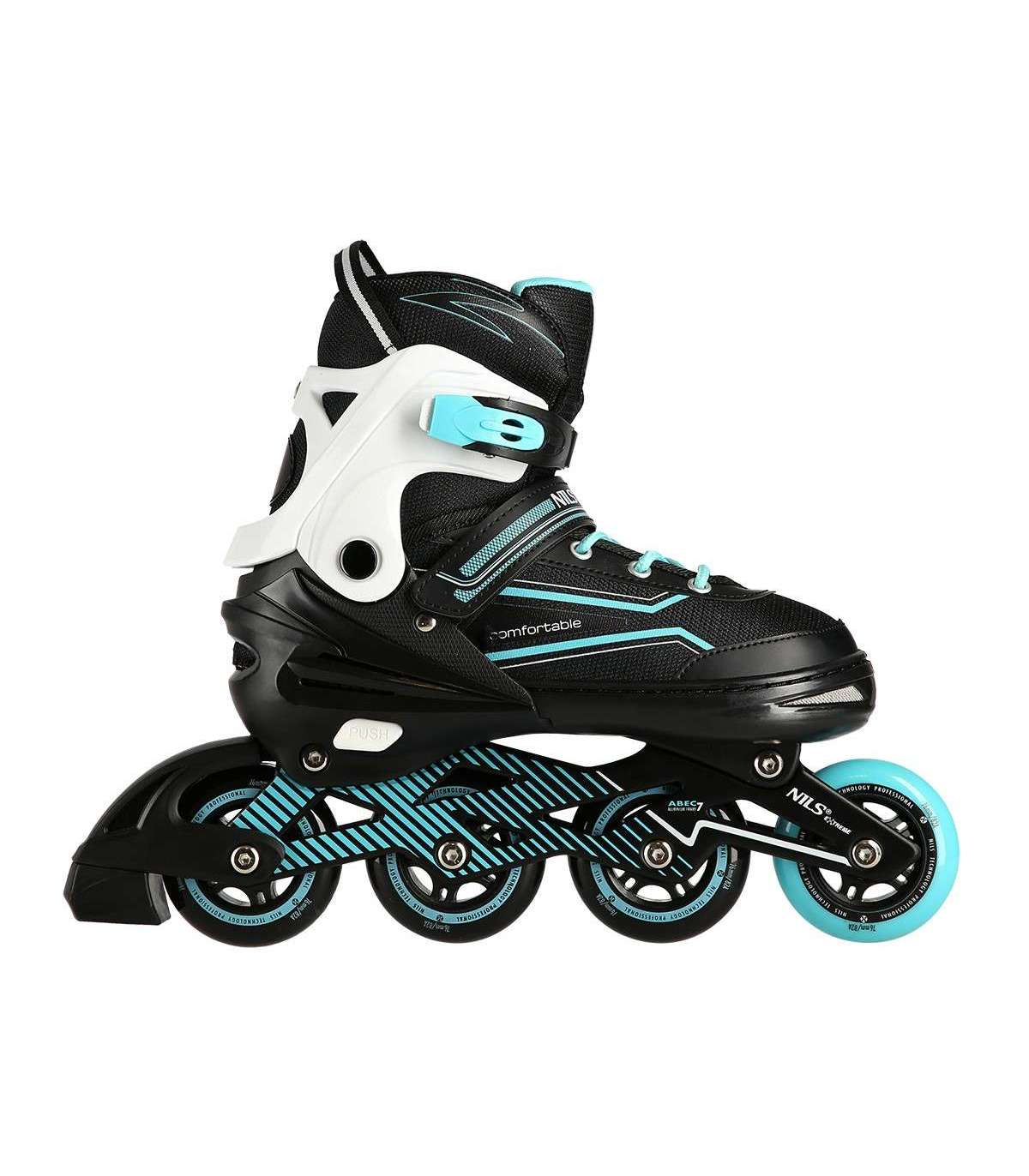 NA1169A Nils Extreme is a model of inline skates designed for beginners and intermediate skaters. It is a combination of interesting design with the highest quality materials that guarantee very high comfort of use.High qualityThe shoe is made of synthetic leather, EVA material, MESH mesh and high-density foam. Thanks to this, the ride will be extremely comfortable. In addition, it has a breathable membrane and is ventilated.Solid constructionThe inline skate is very light thanks to the aluminum skid and the base of the shoe, which is made of high quality PP. In addition, soft wheels guarantee good adhesion to the ground and absorb all vibrations well, while ABEC7 class bearings ensure high quality traction.SecurityFastening the shoe with a two-section buckle, Velcro and laces ensures maximum safety while driving, while the brake made of the highest quality impact-resistant PP will ensure safe stopping, even at relatively high speeds.AdjustableInline skates have the ability to adjust the size of the shoe to the user's foot in 4 levels, thanks to which they will be used for many seasons!Specification:Inline Skate: AluminumBearings: ABEC7Shoe: semi-soft with ventilation systemMaterial:MeshEVASynthetic leatherHigh-density foamBreathable membraneWheels:PU 76mm/82A (L 39-42)Clasp:Two-section buckleVelcro strapLacingInner shoe length: 240-260 mmBrake: Impact resistant PPRemarks:Not for commercial use24 months warrantyImporter: Abisal Ltd. | Poland | 41-807 Zabrze | Pyskowicka Street 17 | e-mail: abisal@abisal.plAbisal Ltd.. declares that the products sold by the company are safe and meet the requirements contained in the Act on General Product Safety of December 12, 2003. (Journal of Laws of December 31, 2003)