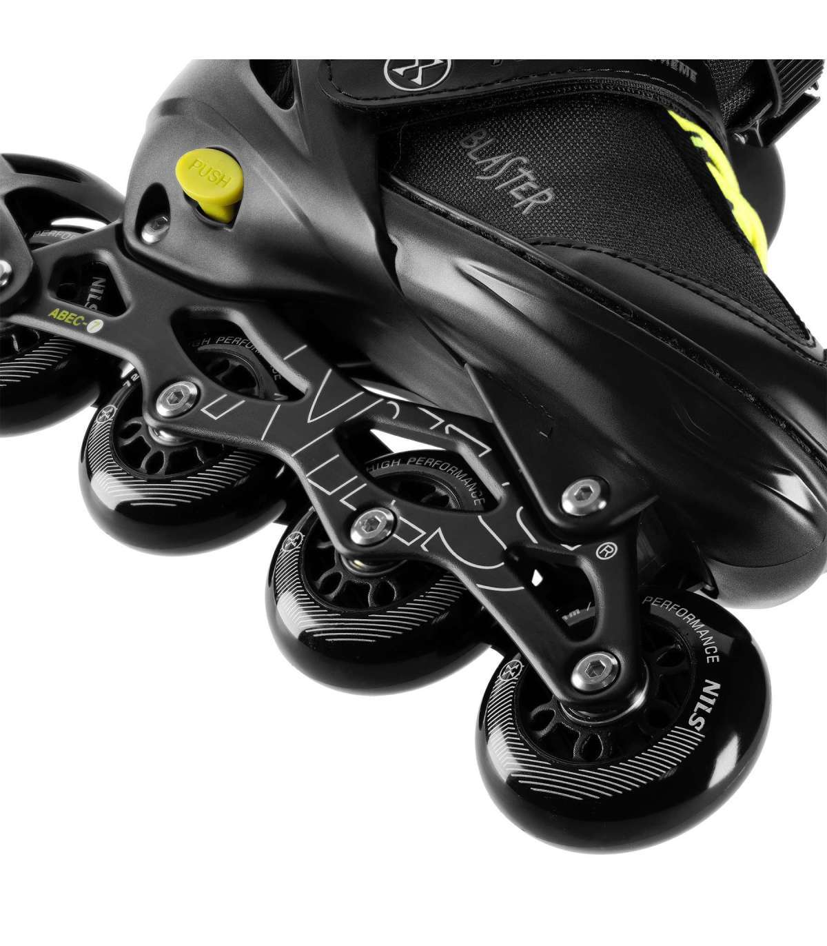The BLASTER NA18168A inline skates from NILS Extreme are the perfect blend of functionality, style, and durability, designed for both youth and adult users. Their attractive, modern design catches the eye, while robust materials ensure long-lasting use. These skates not only provide a comfortable recreational ride but also express individual style, making them an ideal choice for those who value quality and comfort during outdoor activities.SAFETY BLASTER inline skates are designed with the user's maximum safety in mind. Equipped with an effective brake, they ensure secure stopping under any conditions, which is especially crucial in dense urban traffic. The polypropylene shell, resistant to impacts, serves as a protective shield for the feet. The durable material absorbs shocks and protects against the effects of accidental collisions, giving users peace of mind while riding.Fasteners, including a buckle, a velcro strap, and traditional lacing, provide three levels of security that combine convenience with optimal fitting. Thanks to these, the BLASTER skates stay firmly on the feet, ensuring control over the skates and reducing the risk of injuries due to improper foot placement.RIDING COMFORTBLASTER inline skates guarantee not only safety but also exceptional comfort. The ventilated shell improves air flow, providing better air circulation while riding.Wheels with diameters of 64mm, 70mm, or 72mm, adjusted according to the chosen size of the skates, provide smoothness and speed of ride, effectively smoothing out terrain irregularities. Thanks to the use of precision ABEC-7 bearings that minimize friction, users can enjoy a hassle-free ride with minimal effort. Furthermore, the adjustable size feature allows the PRINCESS skates to be used over many seasons, adapting to the changing size of the user's feet. This makes the skates effectively "grow" with the user, ensuring prolonged use and fit.By choosing the BLASTER NA18168A inline skates from NILS EXTREME, you are investing in a product that not only prioritizes safety but also provides a comfortable and enjoyable ride for both young and older rollerblading enthusiasts.Specifications:Chassis: aluminiumBearings: steel, ABEC 7Boot: Polypropylene, semi-soft, ventilatedWheels:PU 64mm/ 82A (Size S: 31-34) PU 70mm/ 82A (Size M: 35-38) PU 72mm/ 82A (Size L: 39-42) Insole:Material: EvaContoured insoleFastening:BuckleVelcro strapLacingInner boot length: 185-200 mm (size S), 210-240 mm (size M), 255-275 mm (size L)Inline skate equipped with a brakeNotes:Not intended for commercial useCompliant with PN-EN 13843:2009 standard24-month warrantyImporter: Abisal Ltd. | Poland | 41-807 Zabrze | Pyskowicka Street 17 | e-mail: abisal@abisal.plAbisal Ltd.. declares that the products sold by the company are safe and meet the requirements contained in the Act on General Product Safety of December 12, 2003. (Journal of Laws of December 31, 2003)
