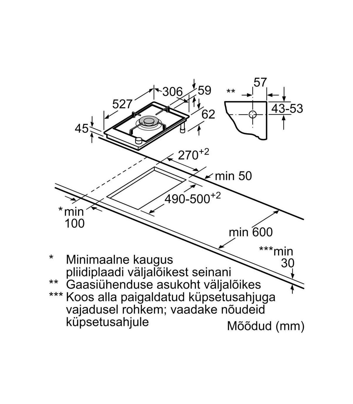 Required niche size for installation (W x L x H): 45 x 270 x 490-500 mm