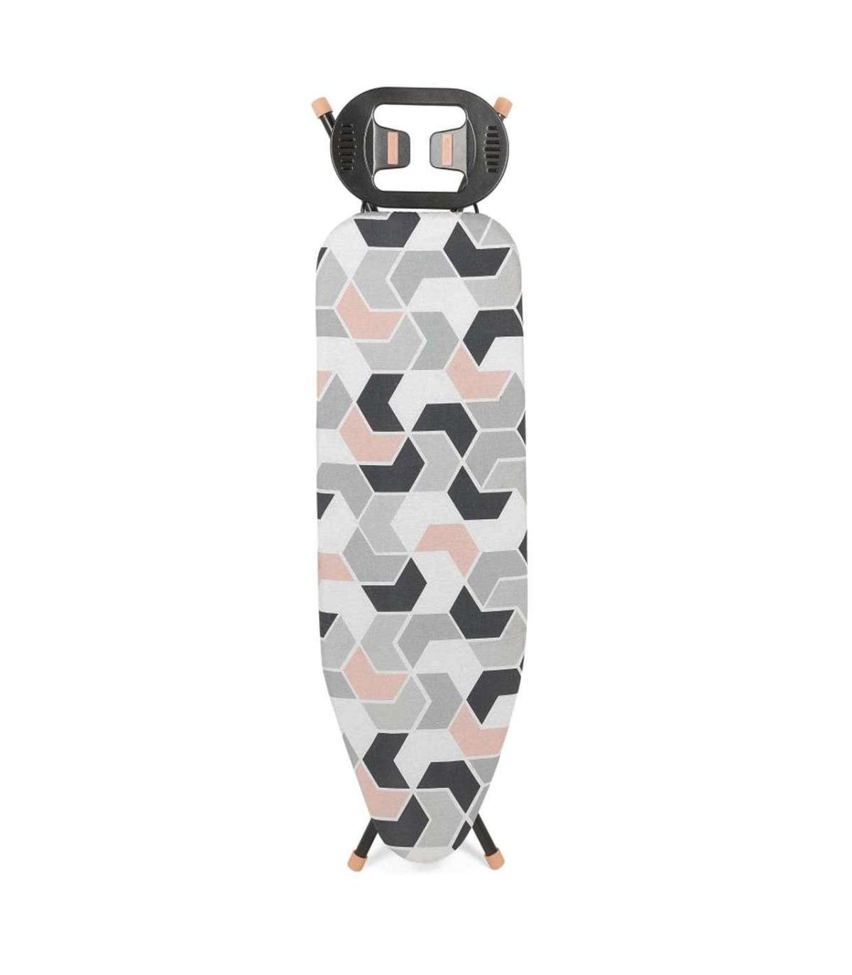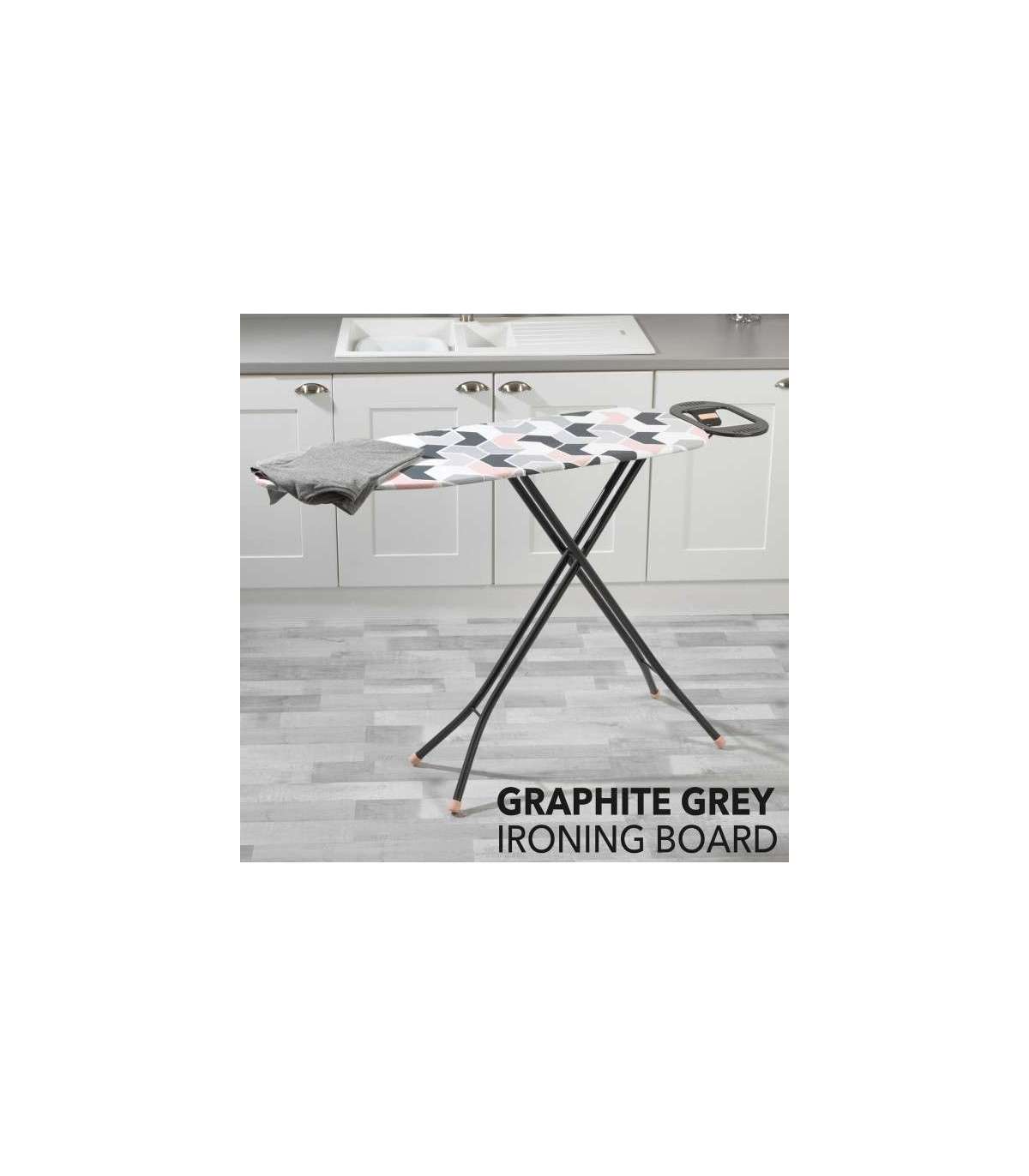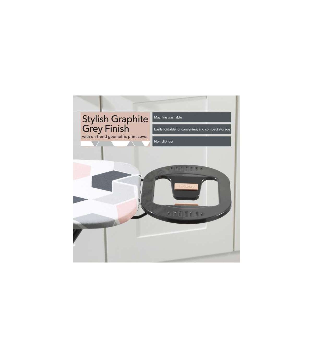Triikige oma riideid värskelt selle Beldray grafiithalli triikimislauaga, millel on elegantne püstolimetalli viimistlus ja geomeetriline trükk.