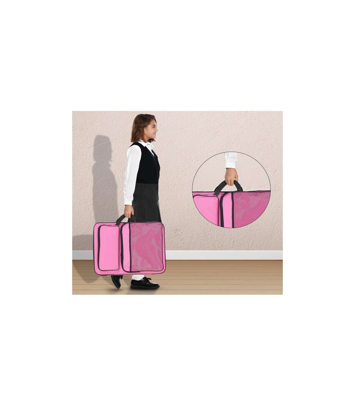 Форма портфеля помогает аккуратно разместить мольберт внутри и защитить его от царапин и загрязнений при переноске. Удобные ручки и/или лямки позволяют ребёнку самому носить мольберт на занятия в художественный кружок, в школу или брать с собой в гости.