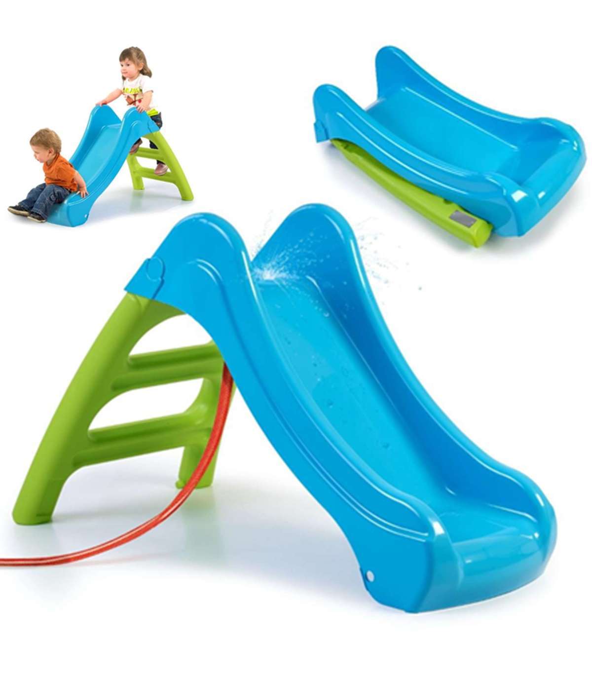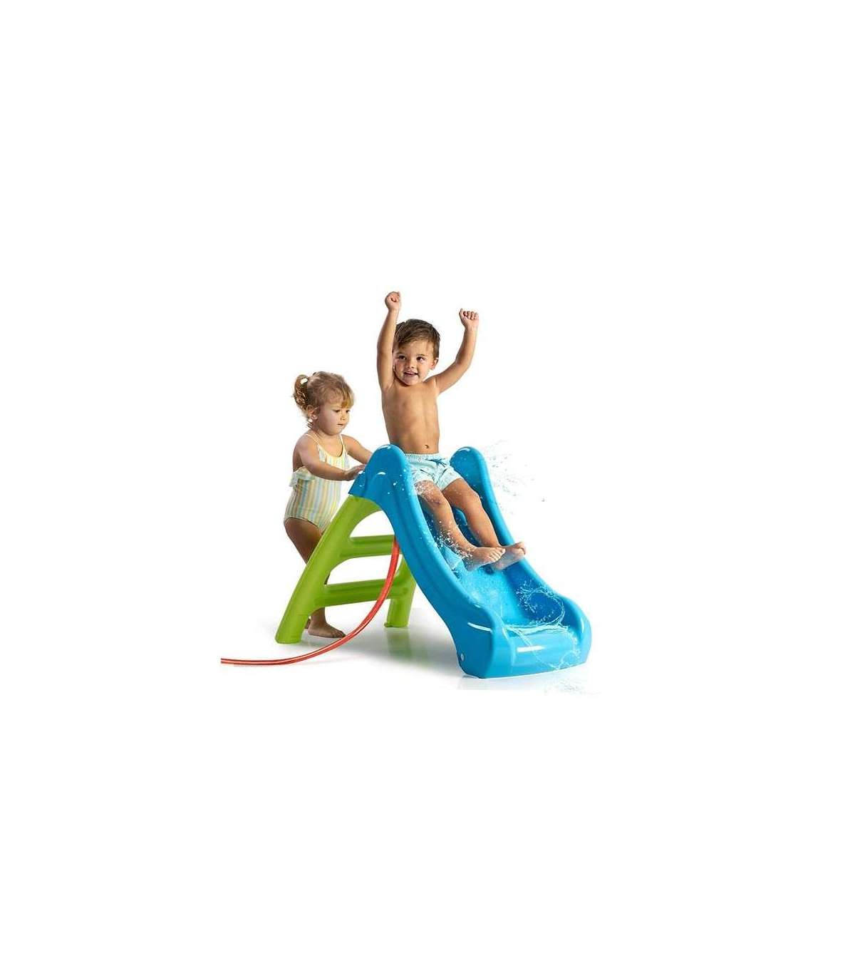 Горка First Slide от испанского бренда FEBER для детей с 1 года. Идеальна как первая горка для ребёнка. Функция 2 в 1 — возможность подключить садовый шланг к спуску и получить водную игровую площадку, идеальную в жаркие дни. Её можно легко сложить и убрать в гараж. Продукт выполнен из прочного и устойчивого пластика, покрытого ANTI-UV покрытием, которое защищает от выцветания.
