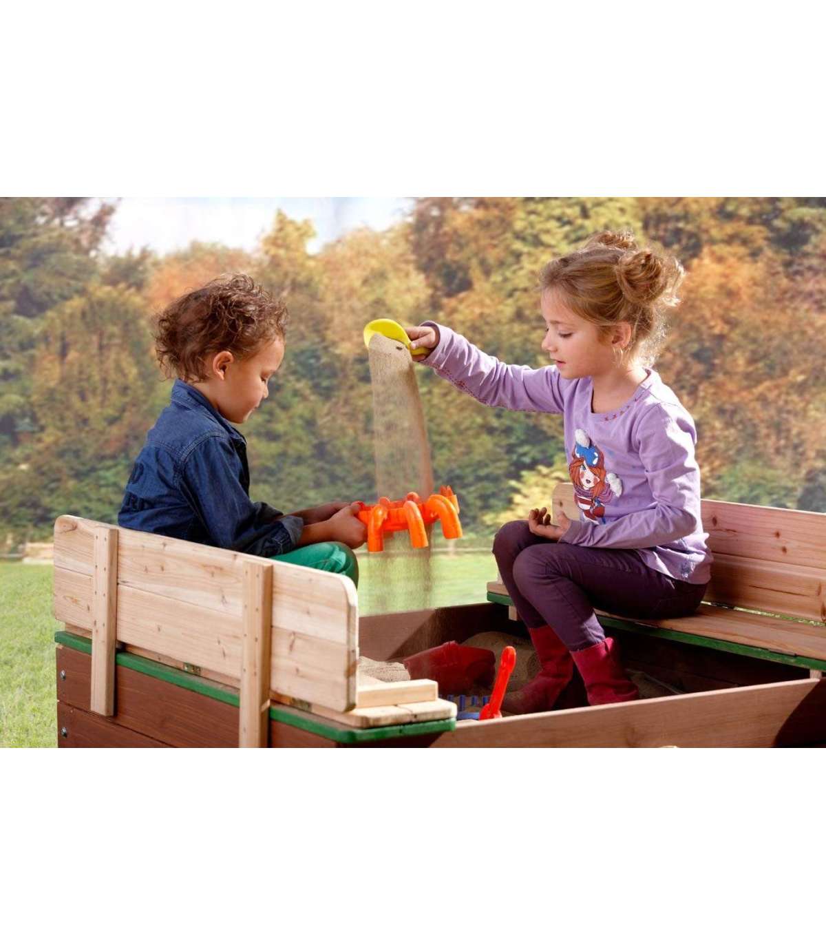 Красивая и универсальная деревянная песочница AXi — отличное дополнение к домашней игровой площадке. Она оснащена практичной крышкой, которая при открытии превращается в две раскладные скамьи со спинками. В песочницу помещается до 250 кг песка! Вся конструкция легко собирается.