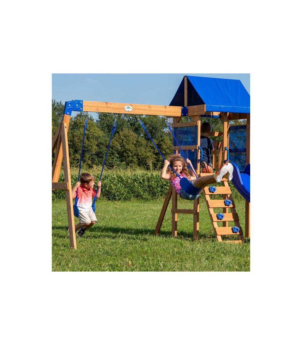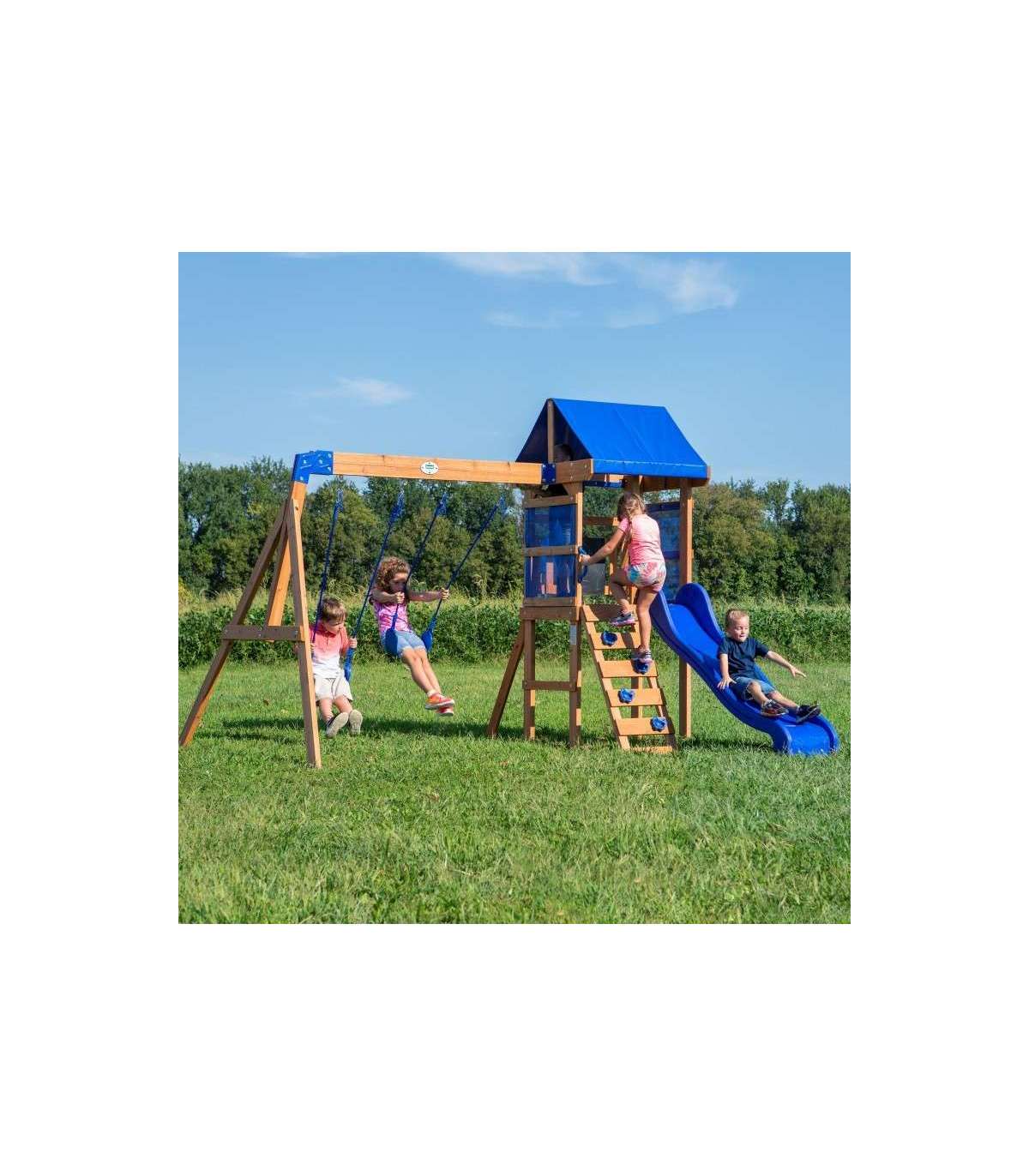 Детская площадка Aurora Backyard Discovery — отличное предложение также для небольших садов. Игра в саду больше никогда не будет скучной! Деревянная детская площадка Aurora предлагает множество возможностей для игры. Здесь есть платформа с волнистой синей горкой, на которую можно подняться по безопасной лестнице, которая также служит стеной для скалолазания. Всё покрыто синим навесом, который обеспечит ребёнку укрытие от солнца. В нижней части находится песочница и две прочные качели.