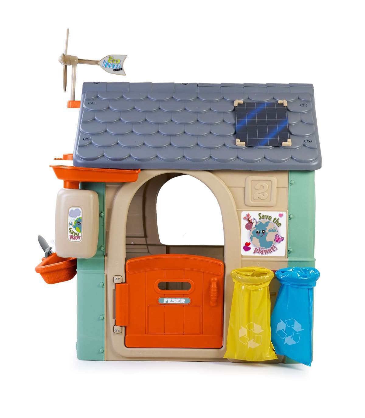 Домик FEBER Recycle ECO выполнен на 90% из экологичных пластиковых материалов, полученных из переработки. Победитель ToyAward 2024 на крупнейшей ярмарке игрушек в Нюрнберге за всестороннее экологическое обучение. Это хорошо выполненный игровой домик, в котором есть все активности, необходимые малышам для пробуждения любопытства к природе. Отличное место и отличное обучение для детей по вопросам сортировки отходов, переработки, экологического выращивания растений и производства зелёной энергии благодаря ветряной турбине и солнечным панелям на крыше. В комплекте 2 контейнера для переработки (жёлтый и синий), маленький сад (в горшках) и инструменты. Отличная активность на свежем воздухе для детей. Можно играть в посадку семян и наблюдать за ростом растений. Также оснащён кормушкой для птиц. Дождевая вода идеально подходит для полива растений или цветов. Ветряк и имитация солнечной панели дают замечательные возможности для изучения устойчивых источников энергии! Прочный, простой в сборке и оснащён системой Anti-UV, предотвращающей потерю цвета и повышающей стойкость пластика.