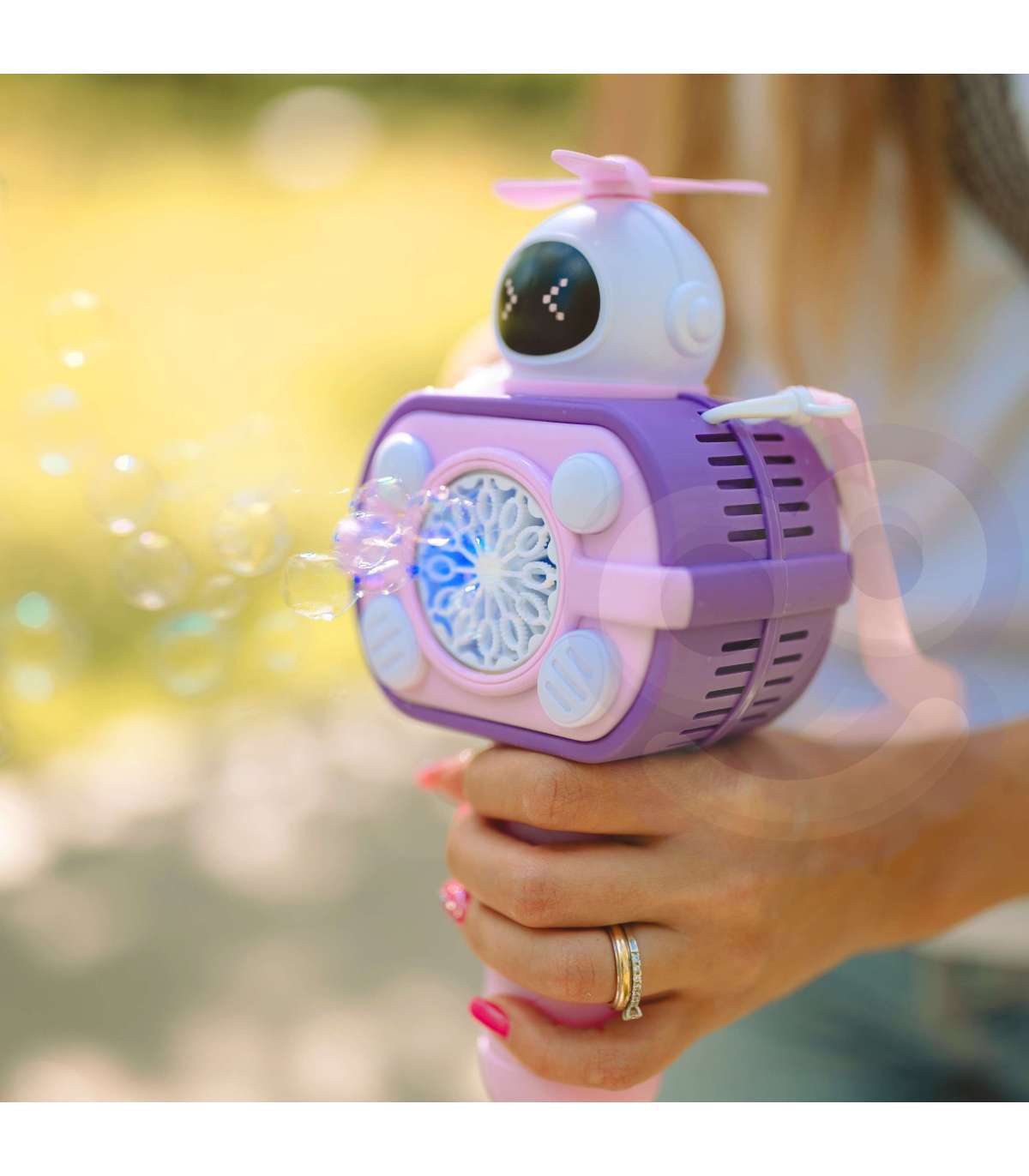 Машинка для мыльных пузырей в форме астронавта бренда WOOPIE — отличная игрушка для детей. Выпущенные пузыри выстреливаются не только с большой частотой, но дополнительно установленный вентилятор выдувает их ещё дальше. Игрушку можно включить, нажав кнопку, и машина будет автоматически выпускать пузыри. У игрушки есть шнурок, который ребёнок может повесить на шею, гулять и выпускать пузыри без необходимости нажимать какую-либо кнопку. У астронавта есть световые эффекты, а в комплекте также есть контейнер для жидкости для пузырей, который прикручивается на место ручки, а затем на него надевается ручка. Игрушка отлично подойдёт для игры на улице и в доме.