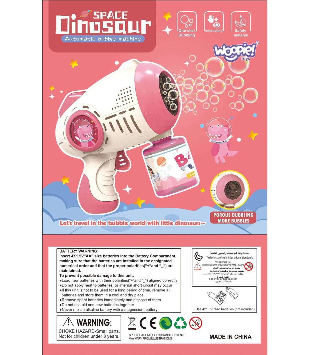 Машинка для мыльных пузырей с милым изображением динозавра от бренда WOOPIE восхитит вашего ребёнка! Мыльные пузыри — любимая забава детей больших и маленьких. Пистолет для мыльных пузырей — идеальный подарок, потому что он прост в использовании и приносит много радости - одним нажатием на спуск из пистолета вылетает множество пузырей. Игрушка отлично подходит для игр на улице и в доме. Чтобы выпускать мыльные пузыри, после установки аккумулятора достаточно опустить пистолет в раствор на основании, нажать на спуск — и всё! В одно мгновение появляется красивый, сказочный мир, который восхитит и детей, и взрослых.