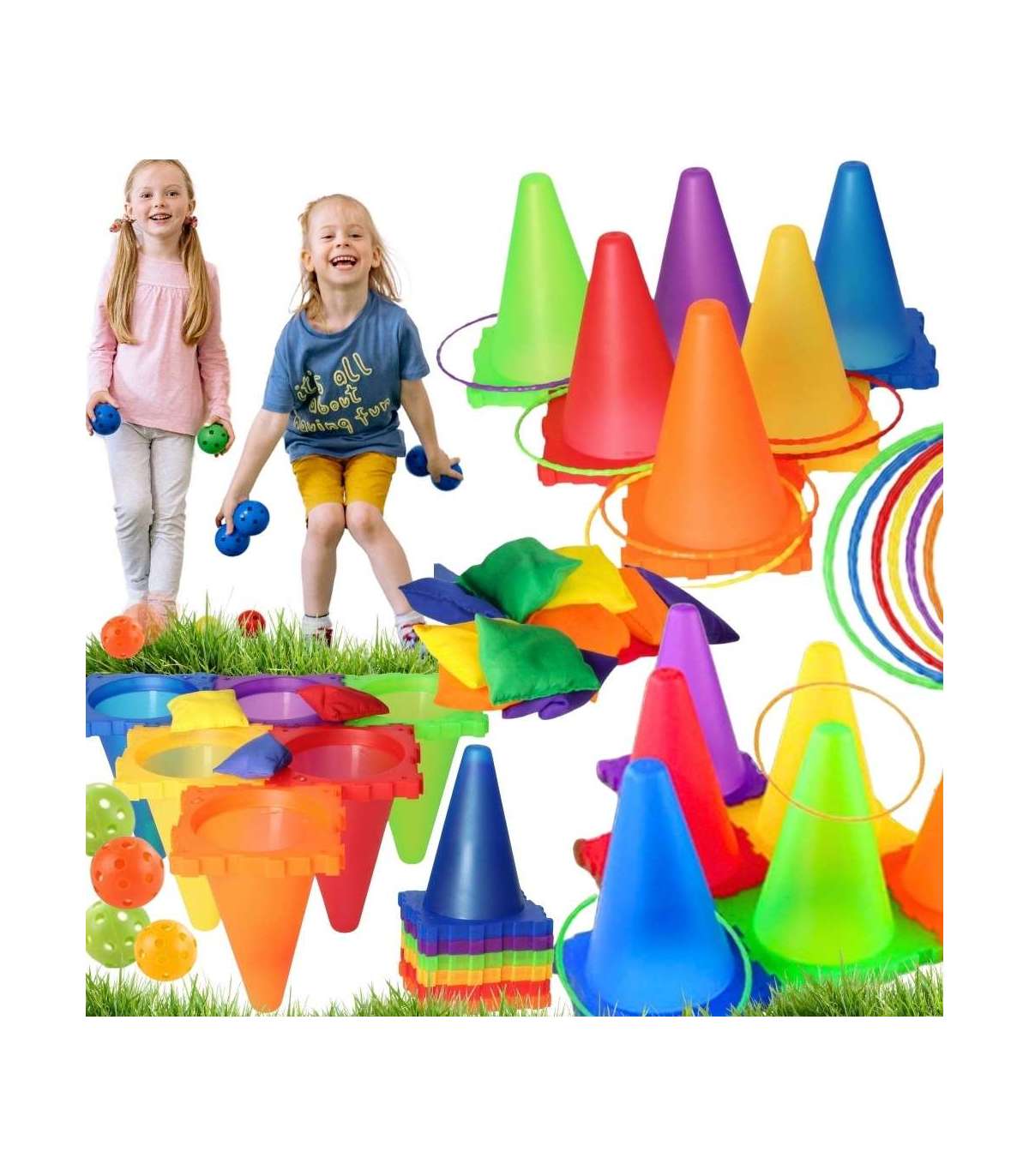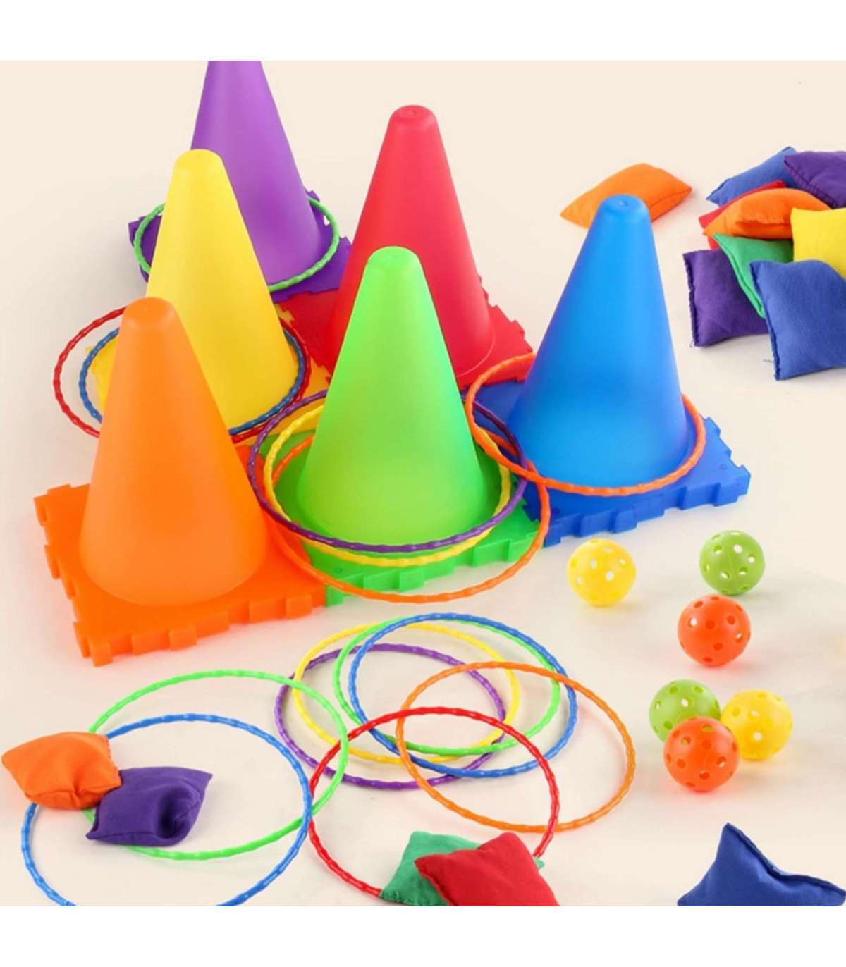3-в-1 набор садовых игр от Woopie – это компактный набор развлечений для всей семьи. Конические маркеры, лёгкие кольца, мягкие мешочки и пластиковые шарики позволяют организовывать множество конкурсов: броски в цель, ринго на конусы, слалом, полосы препятствий или командные эстафеты. Элементы лёгкие, прочные и безопасные — идеально для дома, сада, детского сада и спортивных занятий.