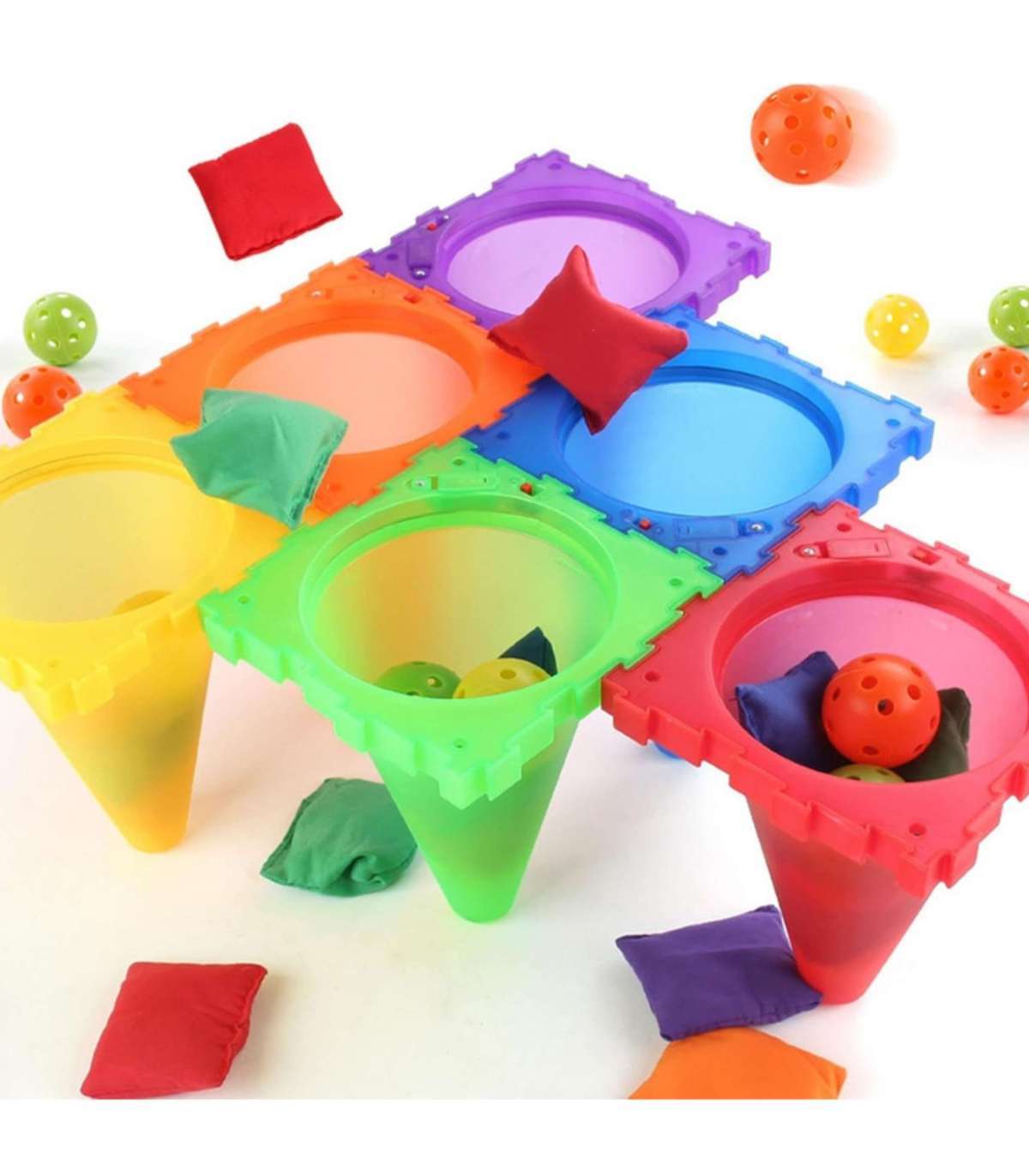 - Игроки бросают мячи в отверстия в конусах.