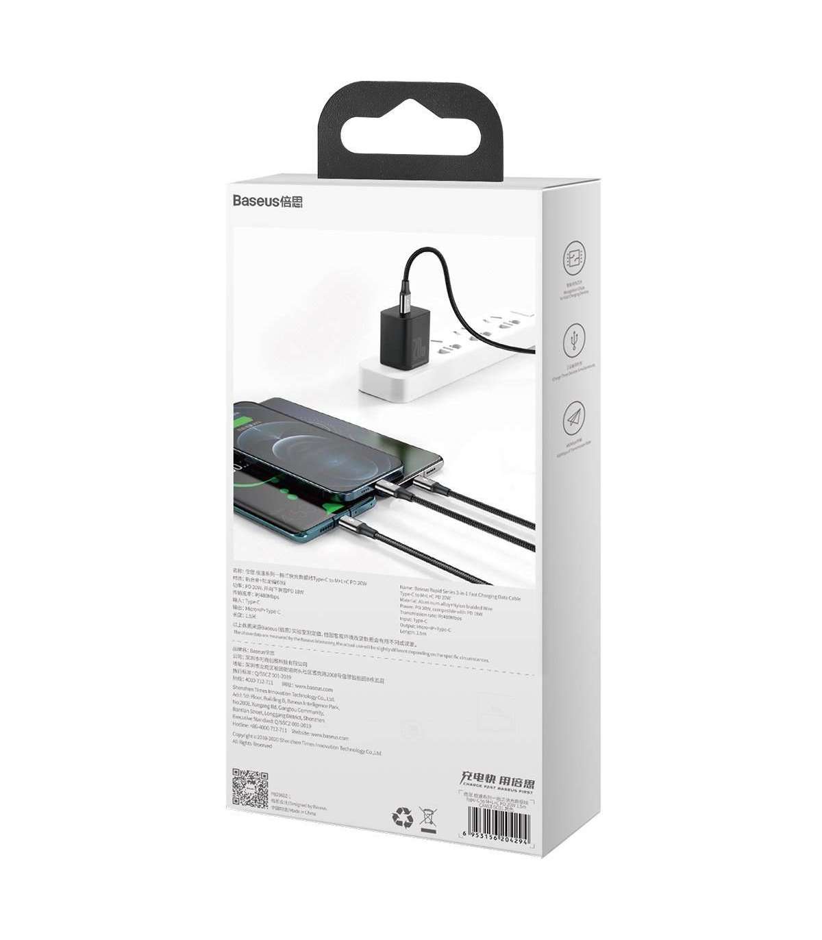 Baseus Rapid Series 3-in-1 cable USB-C For M+L+T 20W 1.5m Black