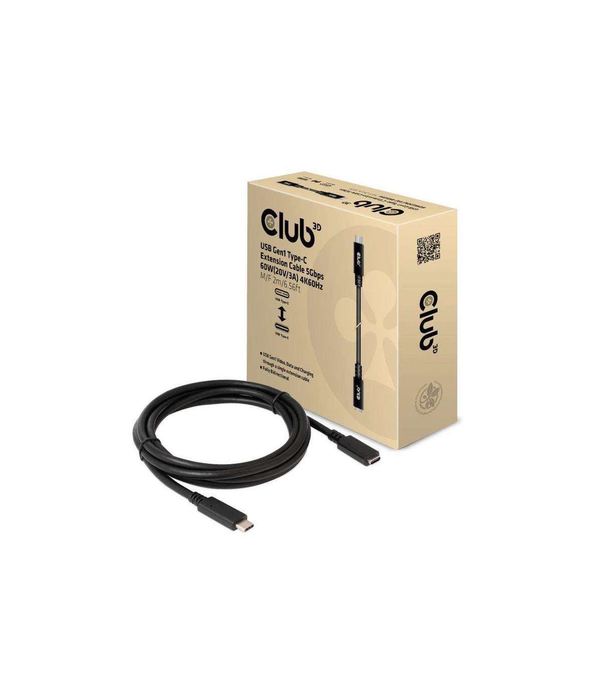 The Club 3D CAC-1529 USB Gen1 Type-C Extension Cable 5Gbps 60W(20V/3A) 4K60Hz M/F 2m/6.56ft connects your Notebook, Tablet or Phone with USB Type-C output to your favorite existing Peripherals, Accessories and Chargers. It enables Video, Data and Power over a single cable and both ways. This cable supports USB Gen1 Video up to 4K60Hz, data up to 5Gbps and up to 60Watt(20V/3A) output for Downstream charging or powering your Notebook, Tablet or Smartphone.
