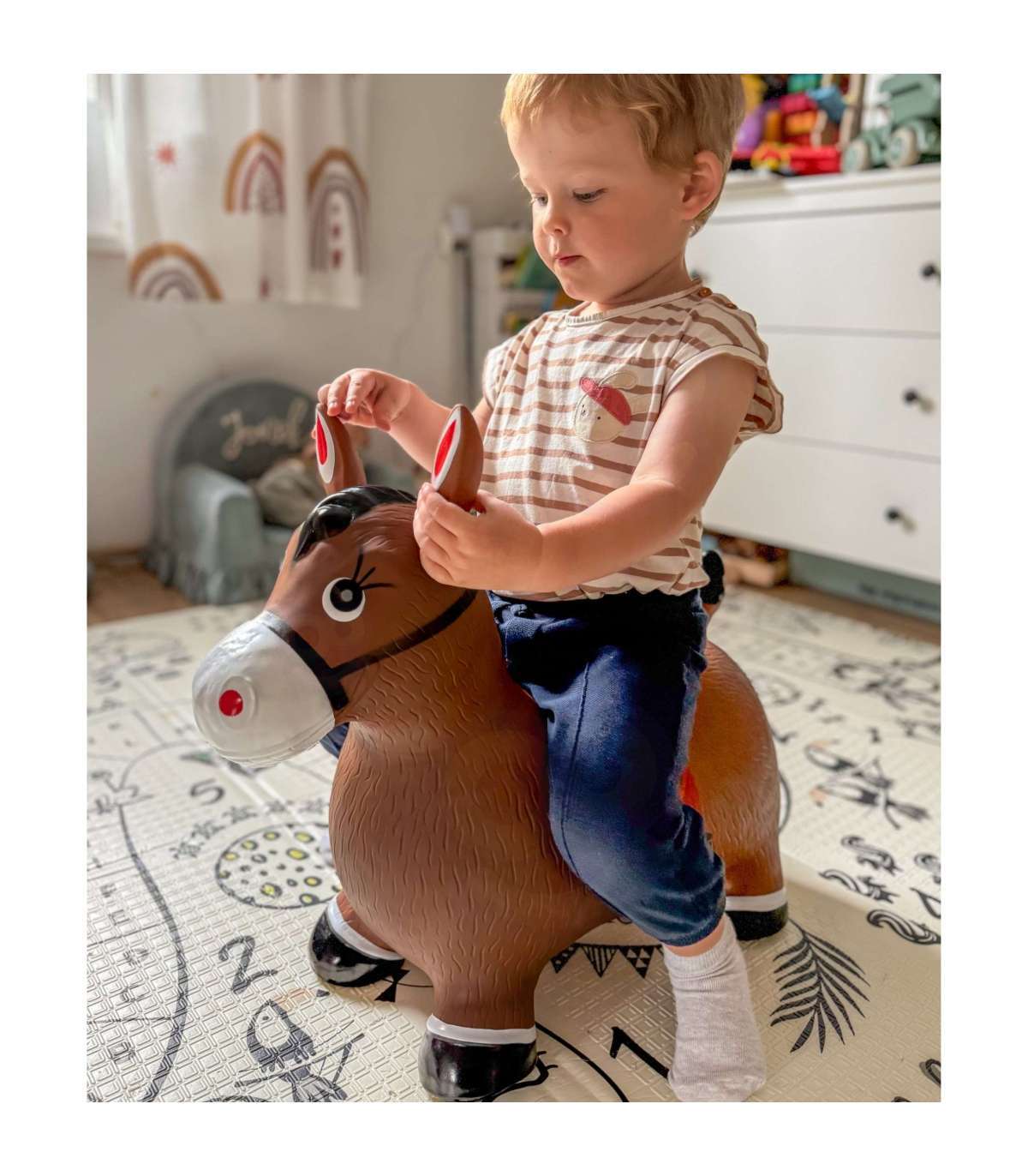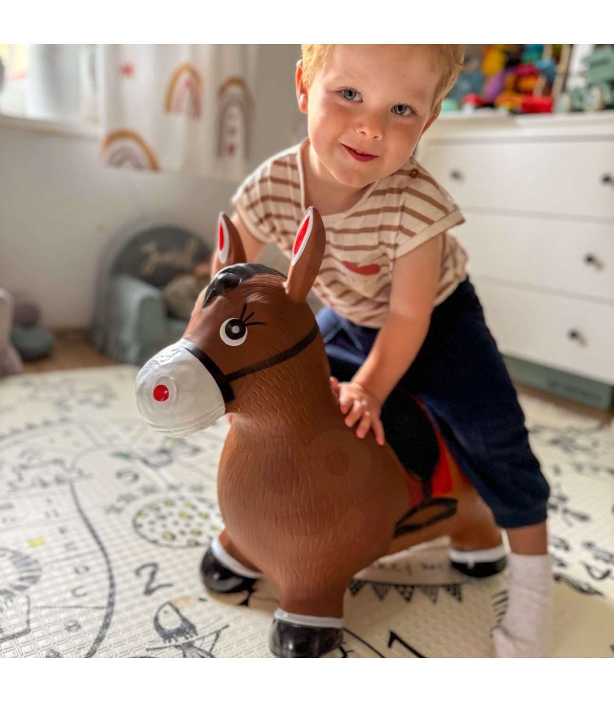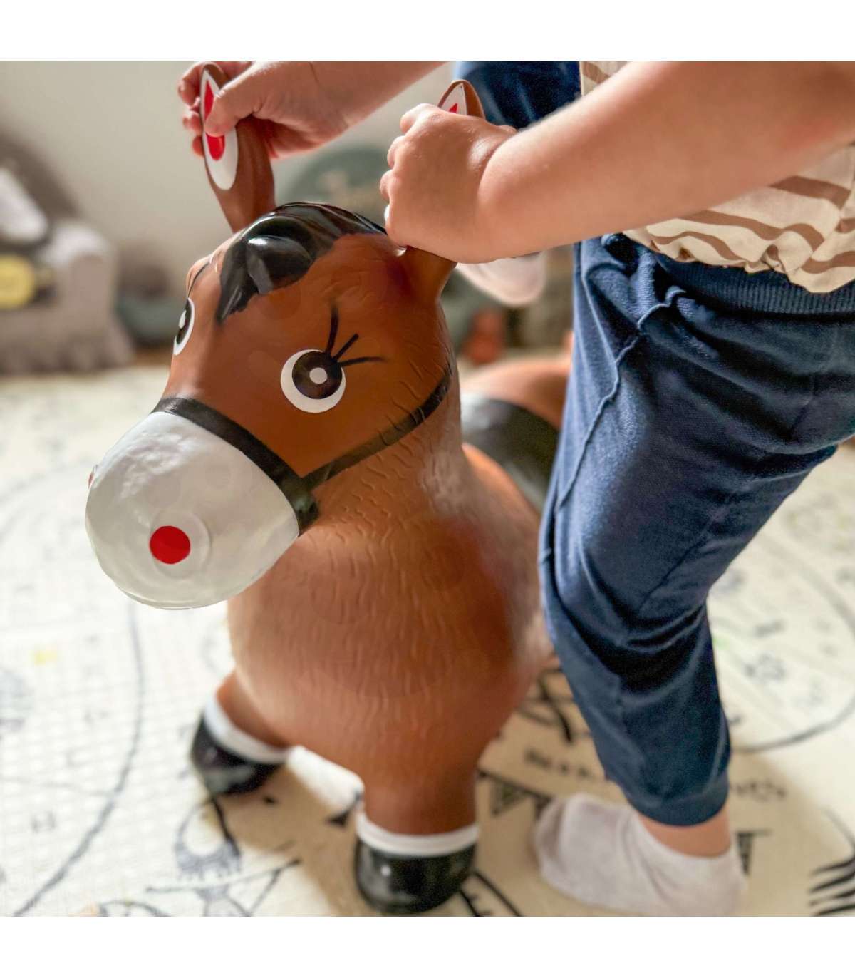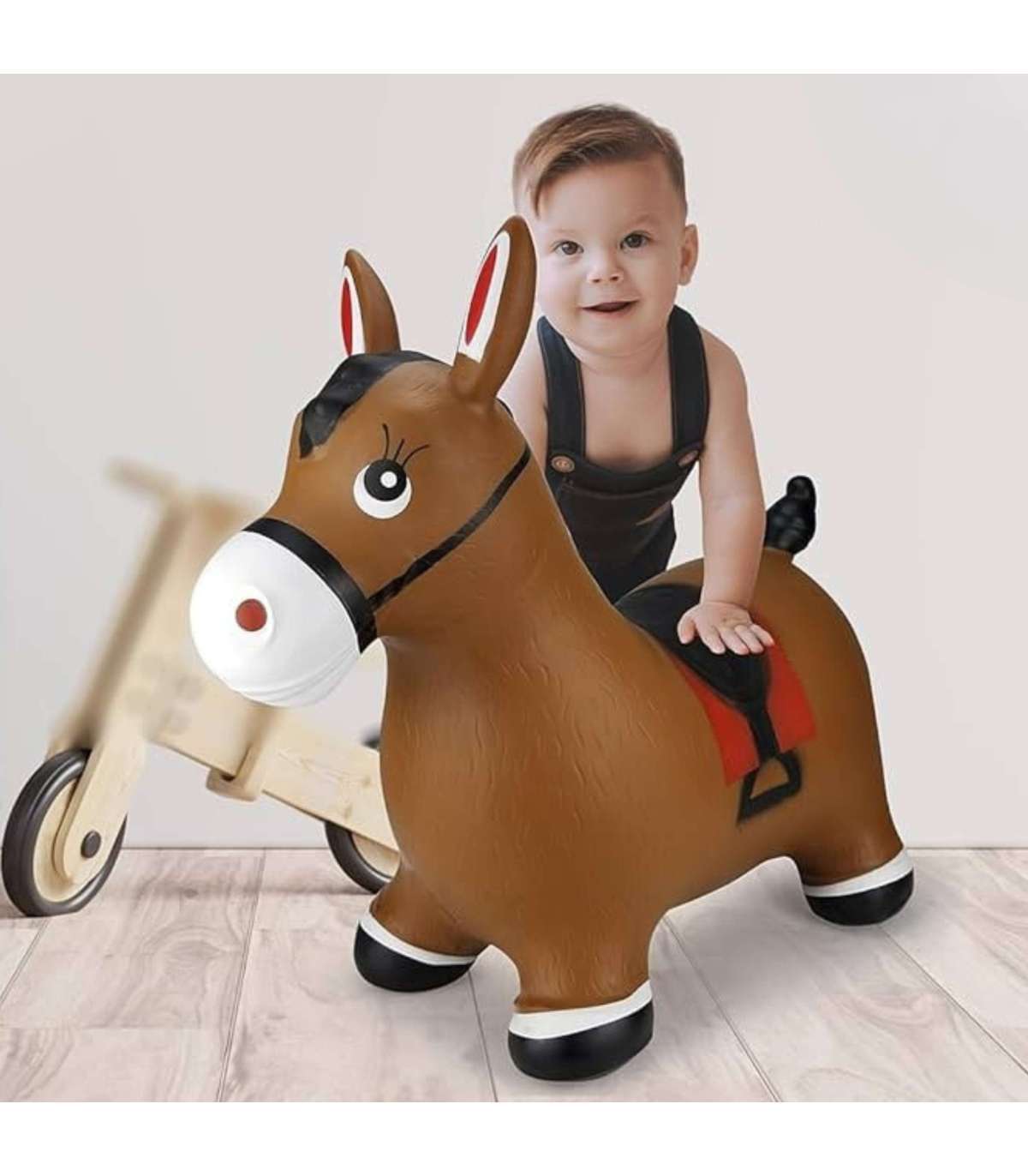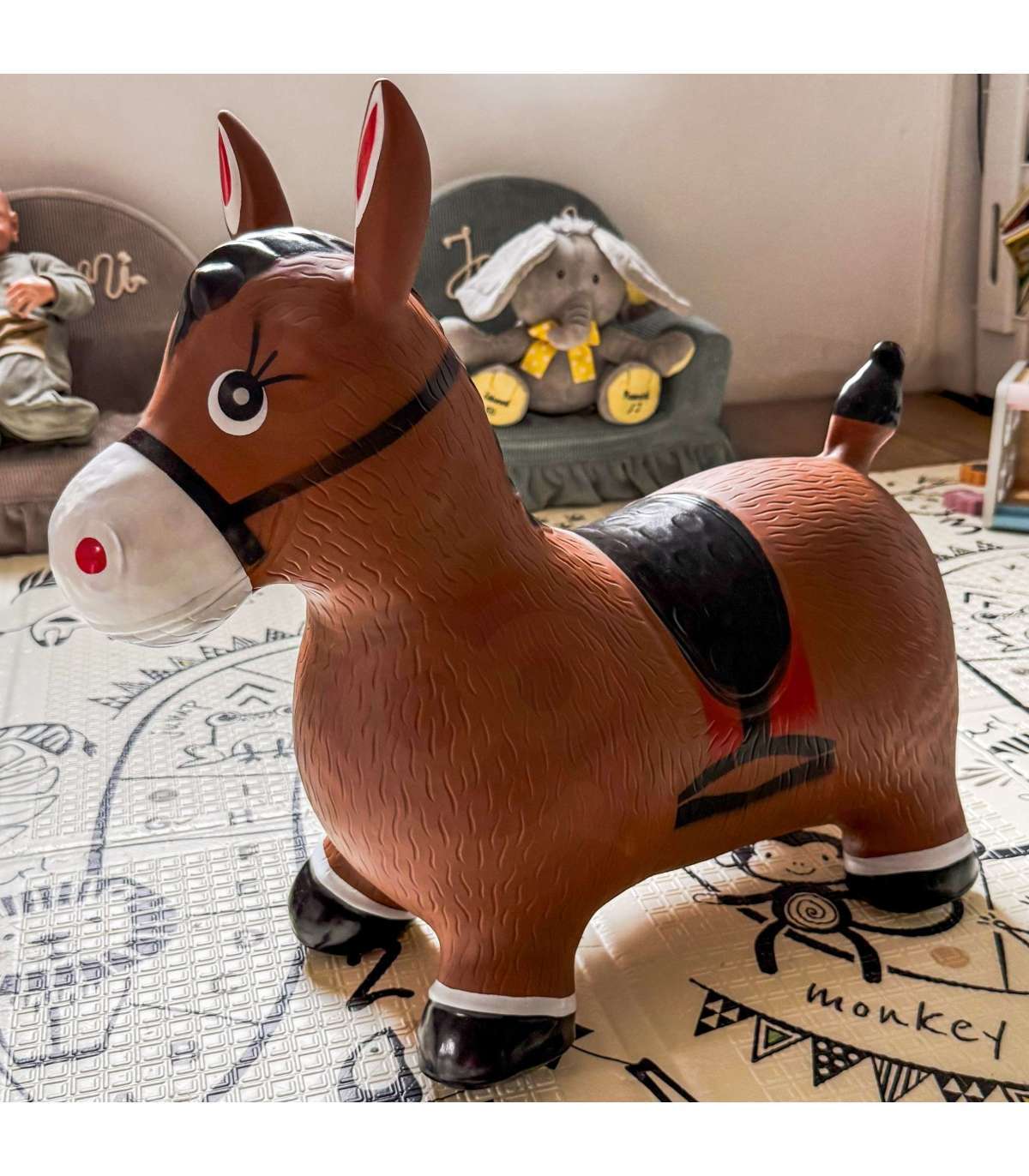 Skaczący Konik-Zabawka Dmuchana od marki Woopie to wesoła i interaktywna zabawka, która dostarcza dzieciom mnóstwo radości z podskakiwania i aktywnej zabawy. Dzięki ergonomicznemu kształtowi, maluchy mogą swobodnie skakać, rozwijając jednocześnie zdolności motoryczne i równowagę. Zabawka zachęca do samodzielnej zabawy, ale świetnie sprawdzi się także podczas wspólnych harców z rówieśnikami lub dorosłymi.