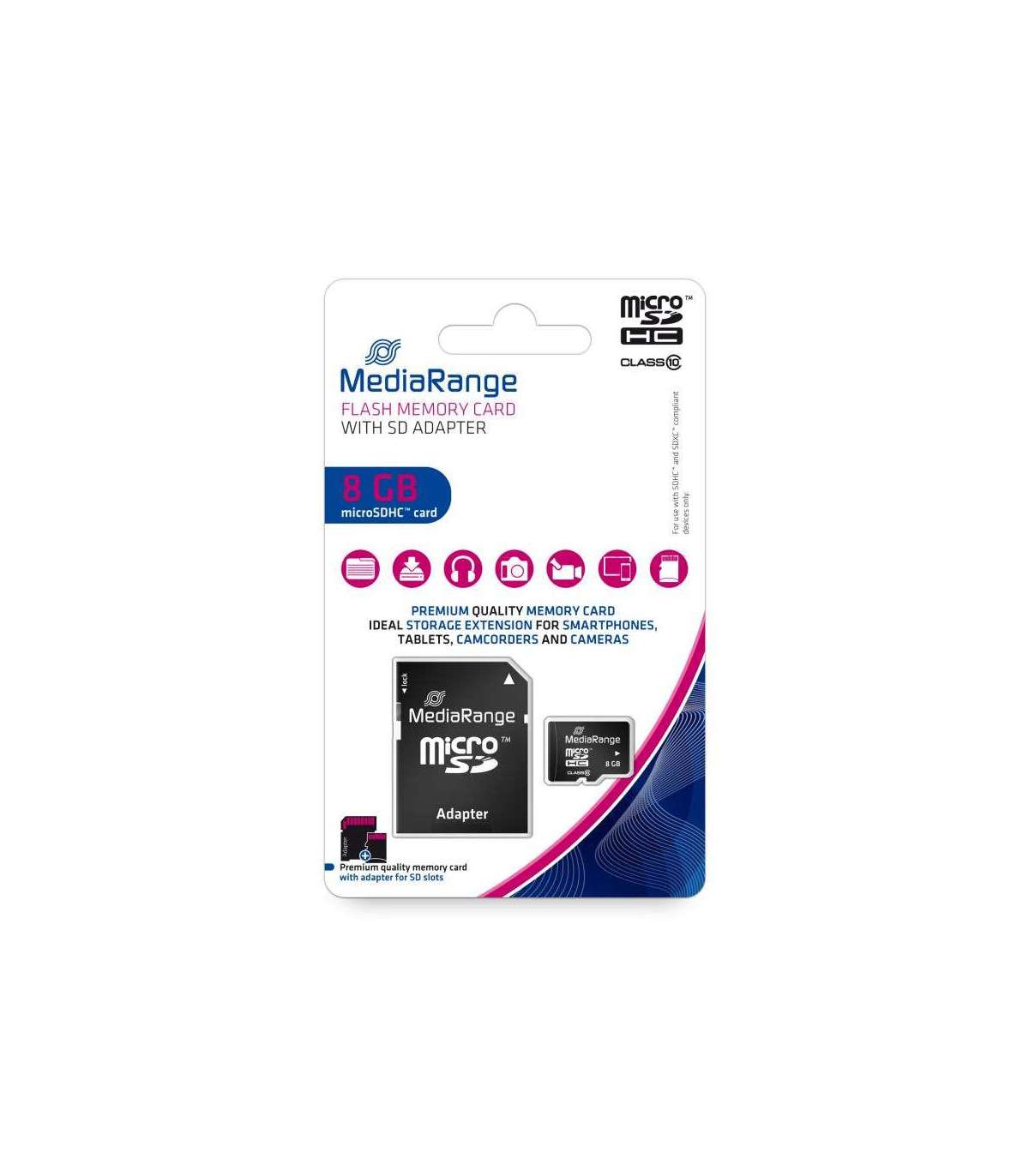 MediaRange flash storage media are known for their extremely good quality and reliability. Our microSDHC memory cards are especially suited for use in portable devices like digital cameras, smartphones, tablet computers, navigation systems, music players and camcorders. The high speed transmission rates prevent delays when photographing, or when copying and downloading your digital data. We even include an adapter which allows you to use the card as an SD or microSD card. The adapter is compatible with all SDHC and SDXC devices and immediately ready for use.