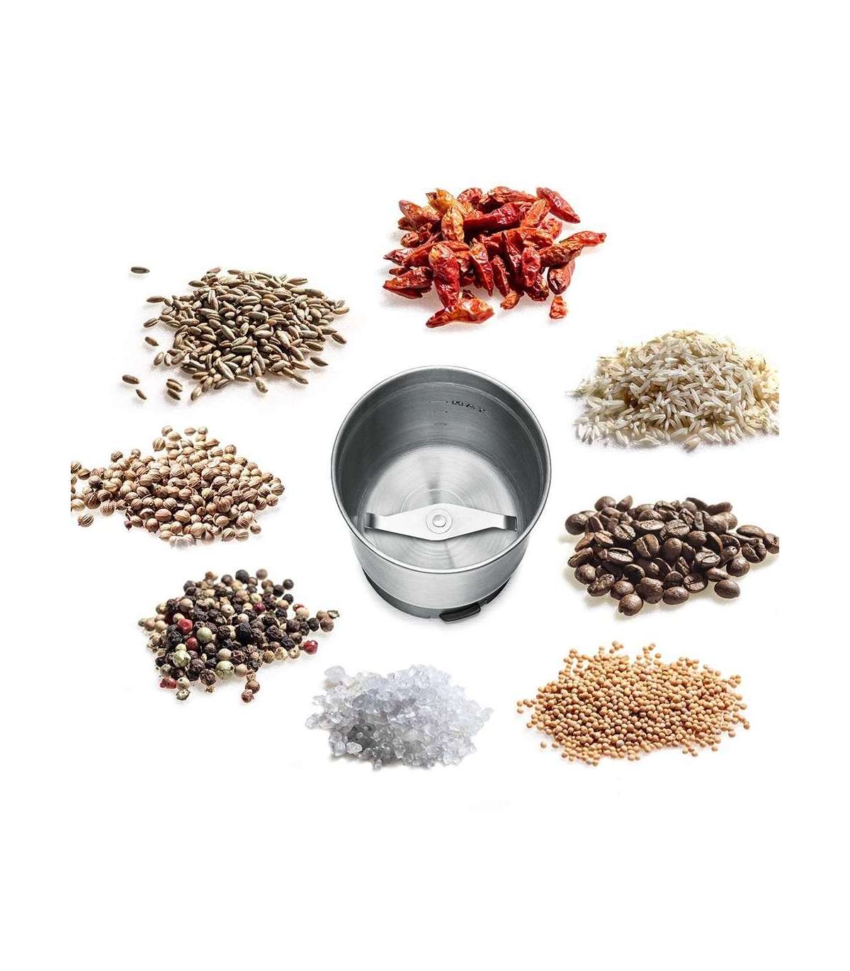 - Included: 2 high-quality stainless steel containers, each with a transparent lid: grinding container with 2-blade impact knife, universal container with 4-blade special knife, coffee scoop with integrated cleaning brush