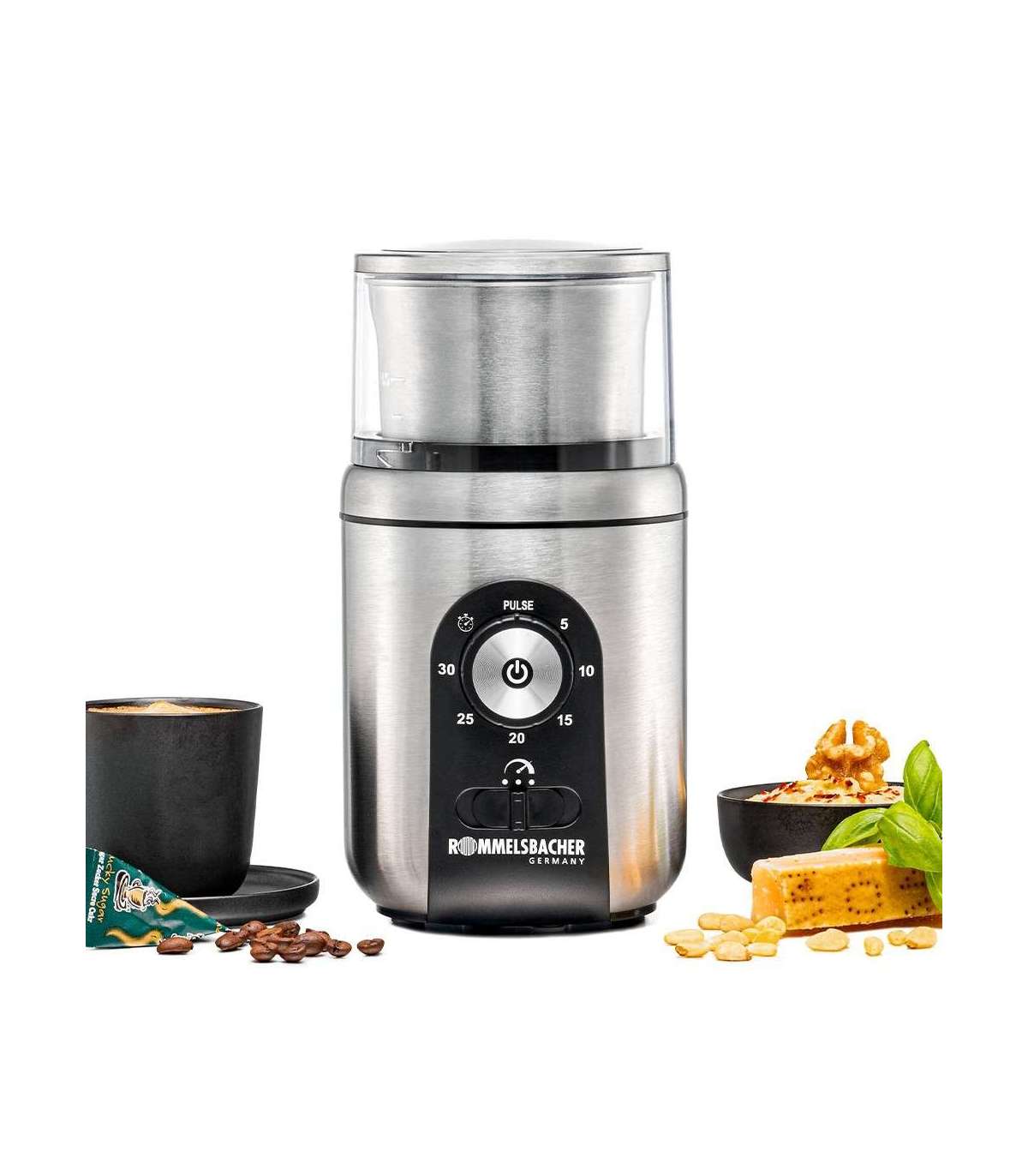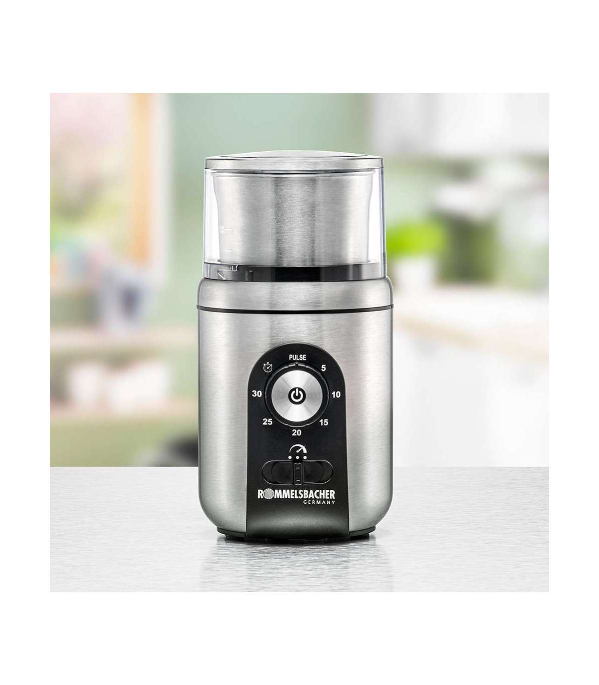 This special spice and coffee grinder from ROMMELSBACHER is perfect for grinding and chopping coffee beans, sugar, spices, herbs, nuts, grains and for preparing pesto, rubs and sauces. The two different work containers made of hygienic stainless steel allow for very variable use: In the grinding container you can make freshly ground coffee powder and grind dry spices such as peppercorns, coriander and caraway in no time. You can also finely pulverize salt or sugar in it. In the universal container you can chop fresh herbs and prepare pesto or rubs for grilling. For the perfect grinding process, the time and speed can be set in several stages, thus guaranteeing a consistent result every time. Manual operation is possible using the pulse function. The removable containers are made of robust stainless steel and are very easy to clean as they can also be put in the dishwasher. The spice and coffee grinder EGK 250 is an indispensable kitchen helper that even demanding amateur cooks will quickly fall in love with.