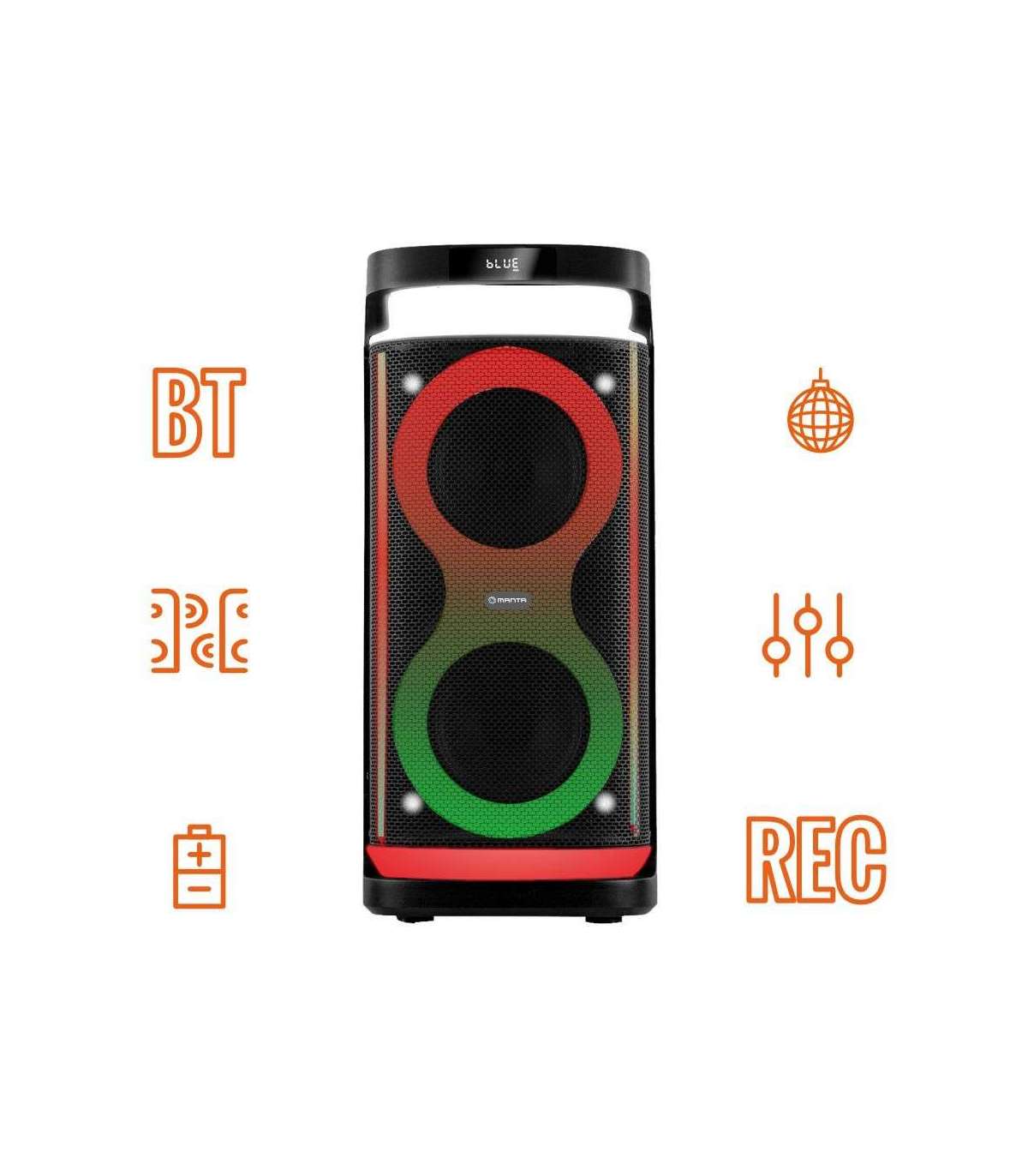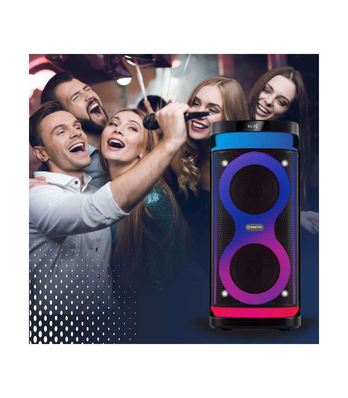 Manta SPK0601B100 portable speaker with karaoke function and microphone is a must for every successful party! Thanks to the Bluetooth connection, it can be quickly paired with a phone, tablet or computer, and the wireless microphone gives complete freedom of movement. With powerful sound, colorful lighting effects and ease of use, this portable speaker is the way to create unforgettable moments with family and friends.