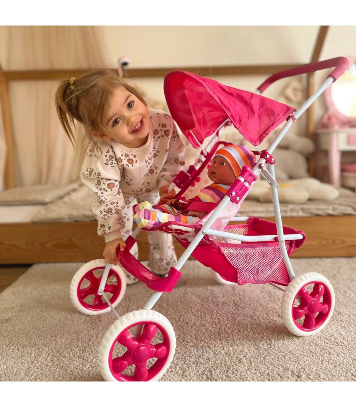 Коляска для кукол марки Woopie — идеальный выбор для каждой маленькой любительницы игры в дом. Она отличается лёгкой, но очень прочной рамой, что обеспечивает комфорт и безопасность при использовании. Оснащена подножкой, козырьком, защищающим от солнца, ремнями безопасности и практичной корзинкой для мелочей, что гарантирует полную функциональность и комфорт. Кроме того, у неё мягкая ручка, облегчающая управление, и тихие, цепкие пенные колёса, идеальные как для дома, так и для прогулок. После игры коляску легко сложить, что экономит место при хранении. Стильный дизайн делает её особенным аксессуаром для любой куклы.
