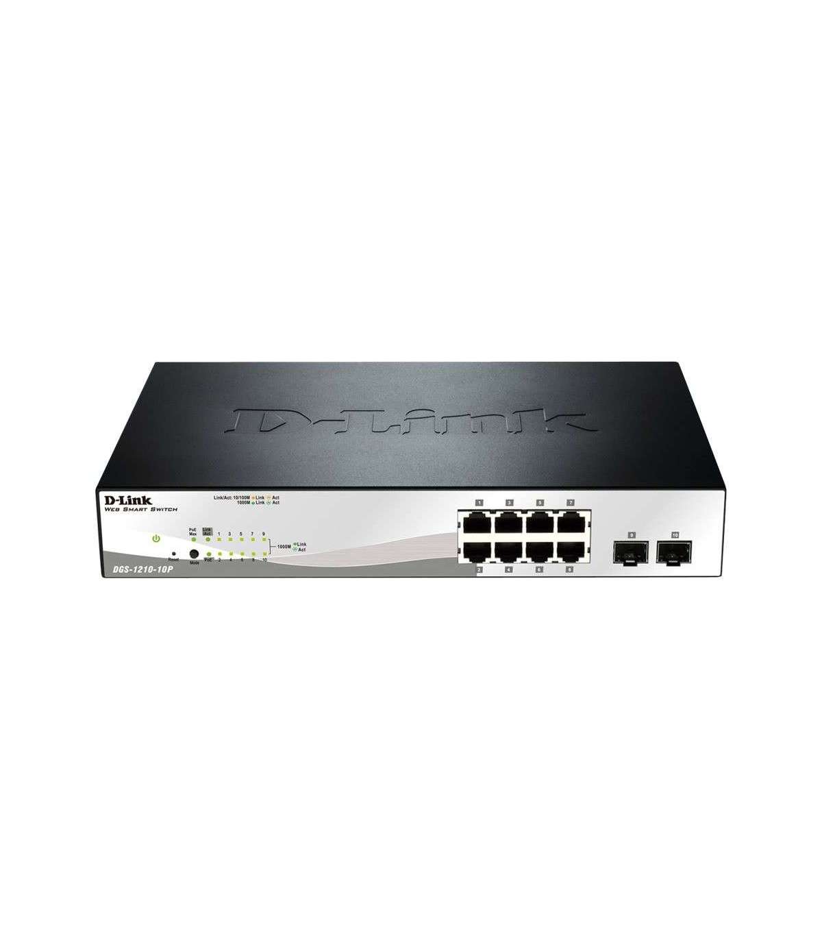 D-LINK DGS-1210-10P, Gigabit Smart III Switch with 8 10/100/1000Base-T PoE ports and 2 combo 1000Base-T/MiniGBIC (SFP) ports, 802.3x Flow Control, Port Trunking, 802.1Q VLAN, 802.1p Priority Queues, Port mirroring, Jumbo Frame support, 802.1D STP, ACL, LLDP, Cable Diagnostics, Voice VLAN, CLI | D-Link | 24 month(s)