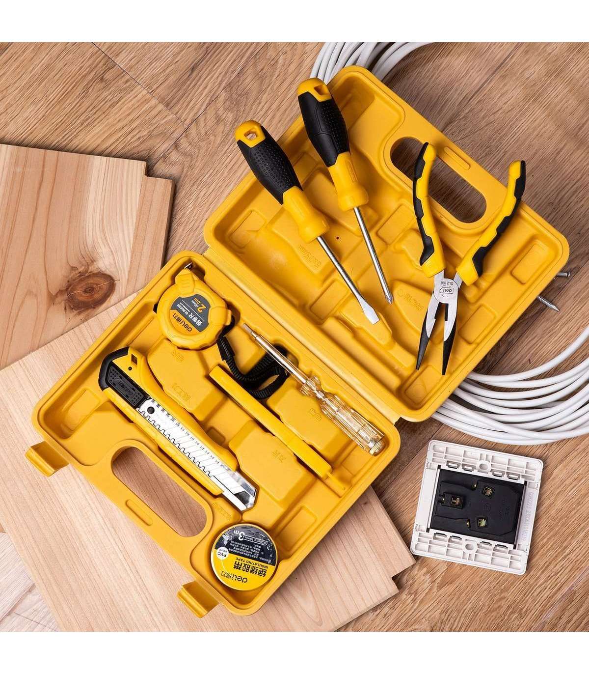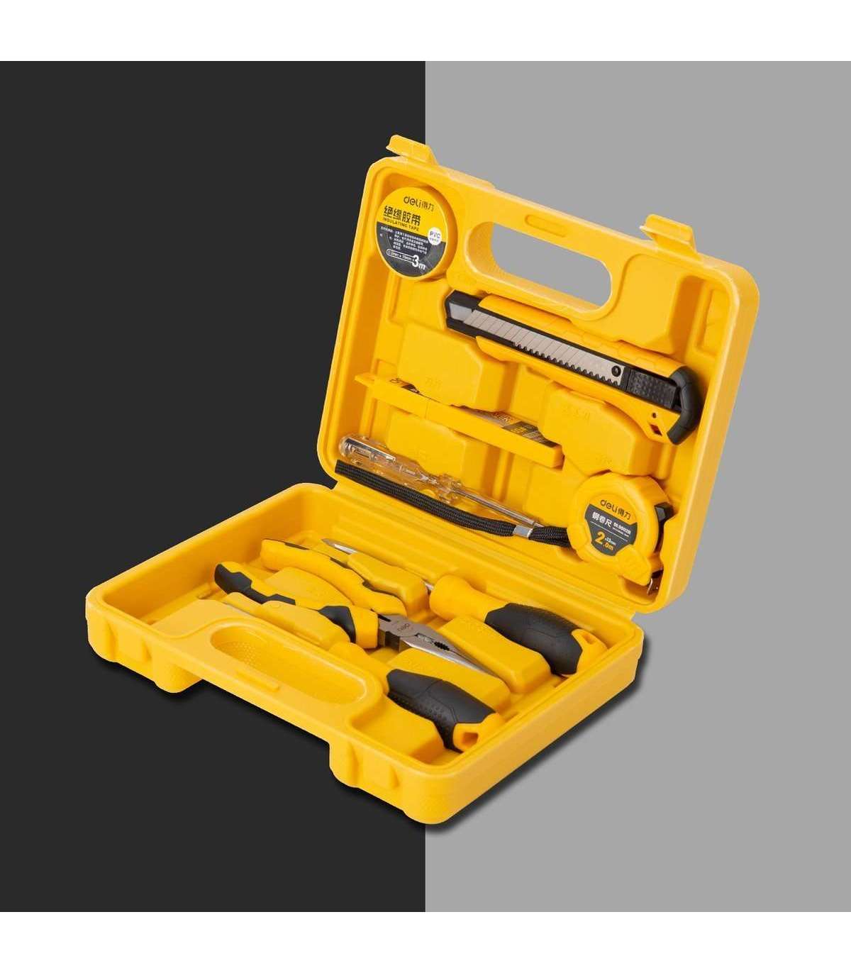 Deli set contains 8 tools that you are sure to use. Assembly of cabinets, kitchen accessories, lamps - in these and similar situations EDL1008J will come in handy. All elements of the set are placed in a practical case, which will make their storage simple and convenient. The set includes: a knife with adjustable blade length, 10 spare blades, a 3m long water and fire resistant insulation tape and a 2m long rolled measuring tape. The package also includes: 2 screwdrivers with a non-slip grip, stainless steel pliers, and a corrosion-resistant voltage tester for sockets with a voltage range of 100-500V.