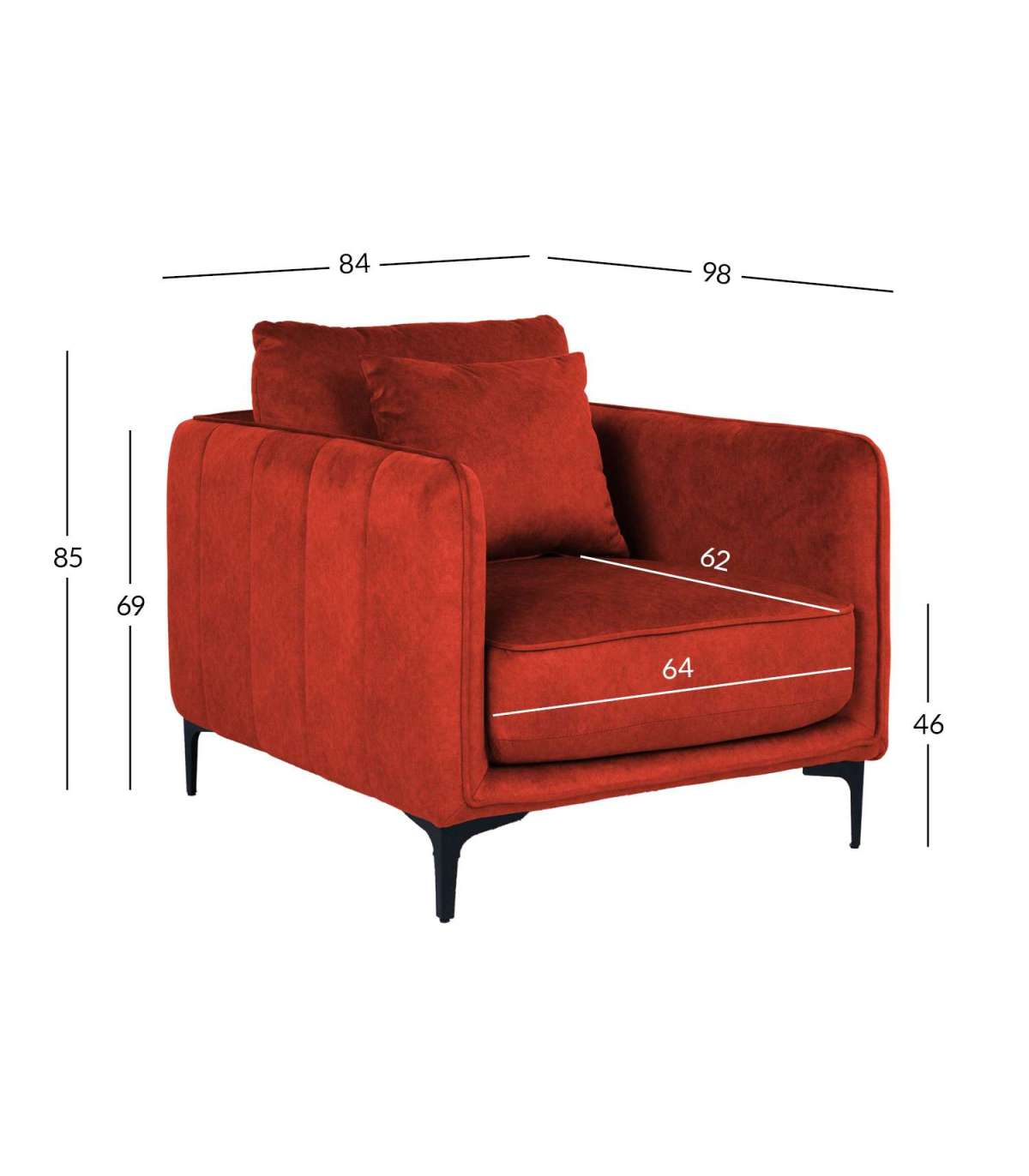 Tugitooli üldmõõdud on 84x98H85cm. Istme laius 64cm, istme sügavus 62cm (ilma padjata 82cm), istme kõrgus 46cm. Käetoe kõrgus maast 69cm.