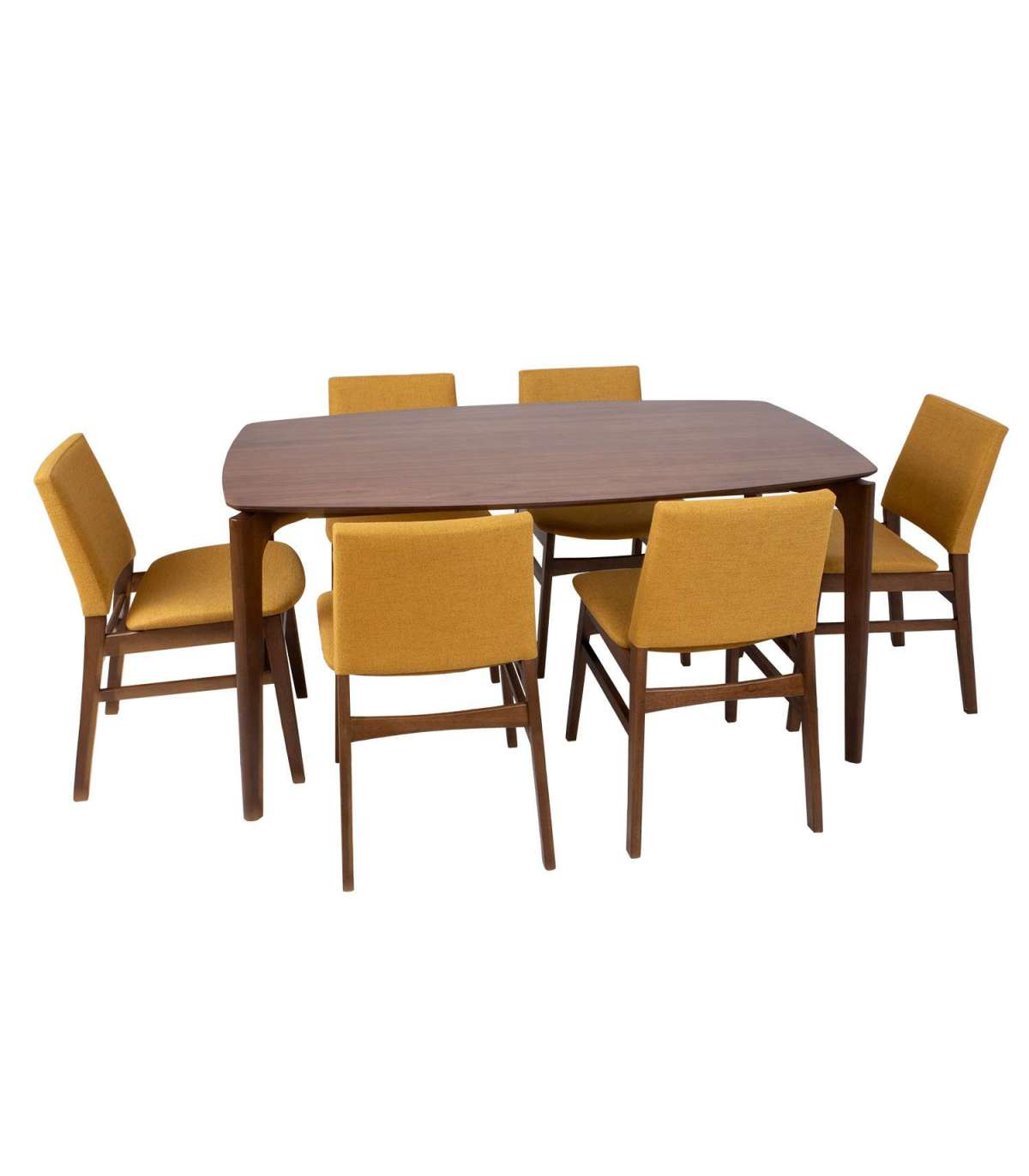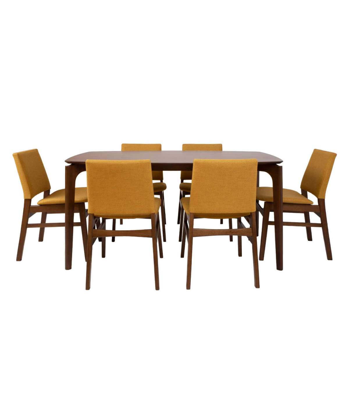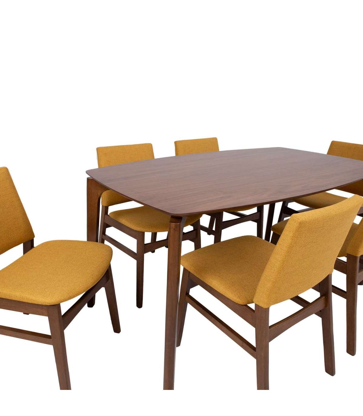 Söögilauakomplekt HAYDIE 6-tooliga. Söögilaua mõõdud on 150x90xH75cm. Lauaplaat: 18mm MDF naturaalse pähklispooniga. Jalad on valmistatud kummipuust. Laud on viimistletud pähkli tooni lakiga. Tooli mõõdud on 46x57xH79cm. Tooli iste ja seljatugi on kergelt polsterdatud ja kaetud kollase polüesterkangaga. Tooli jalad ja raam on valmistatud kummipuust ja viimistletud pähkli tooni lakiga. Kaalupiirang 120kg.