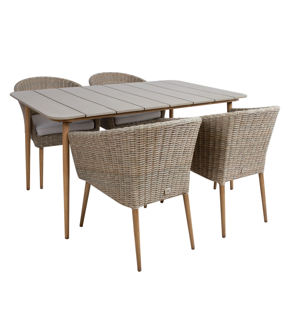 Комплект NORWAY стол, 4 стула. Алюминиевая рама обеденного стола окрашена порошковой краской. Алюминиевый каркас обеденных стульев покрыт искусственным ротангом. В комплект входят мягкие подушки толщиной 6 см. Ножки стульев имеют конусообразную форму и окрашены кистью. Размеры стола 147х90х73см, стула 61х62х76см.