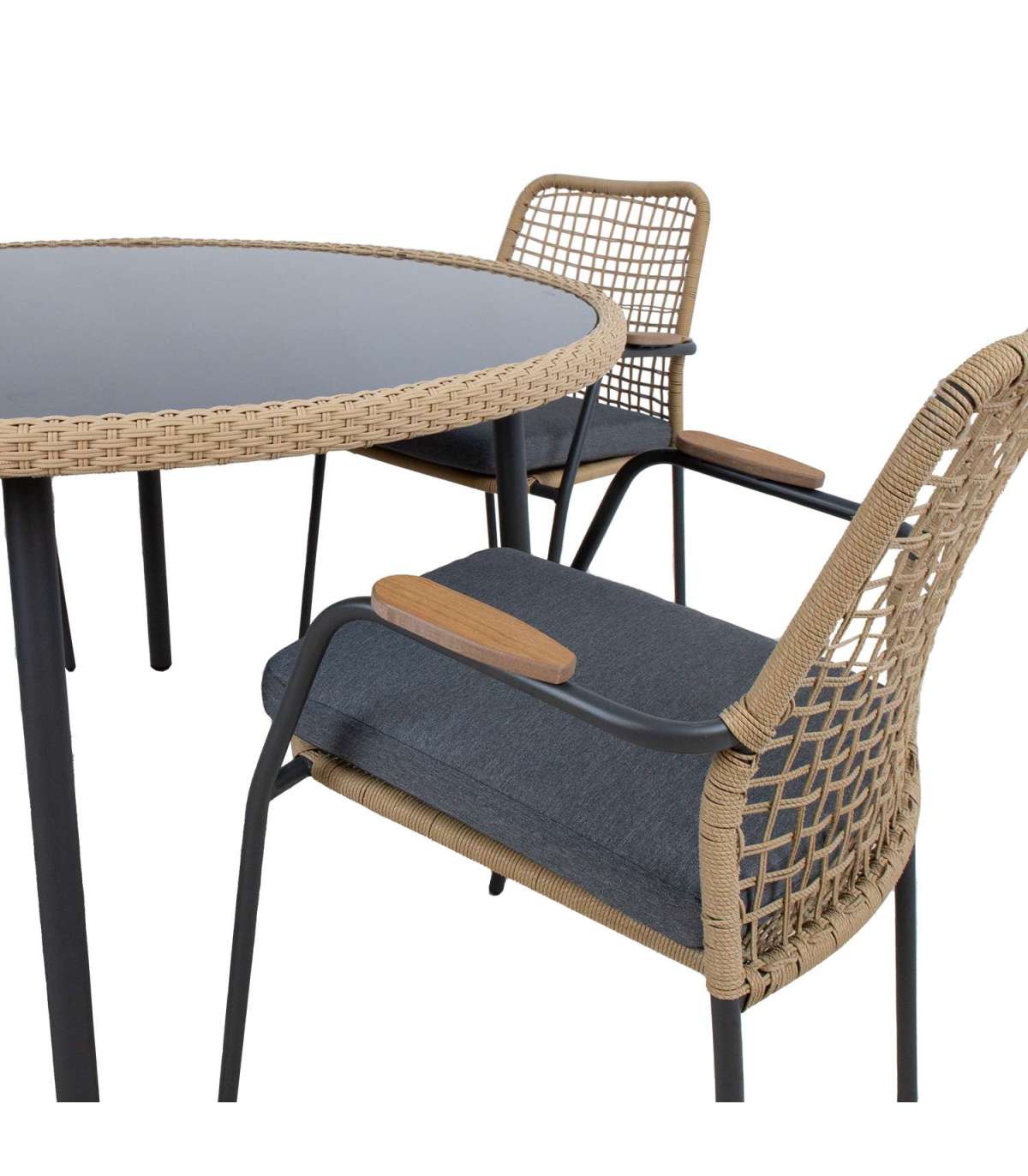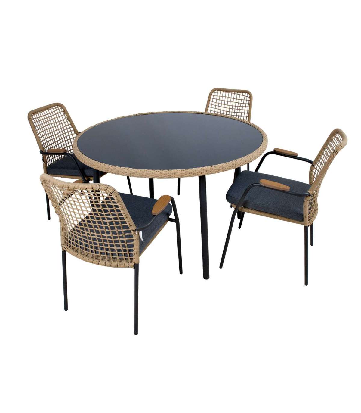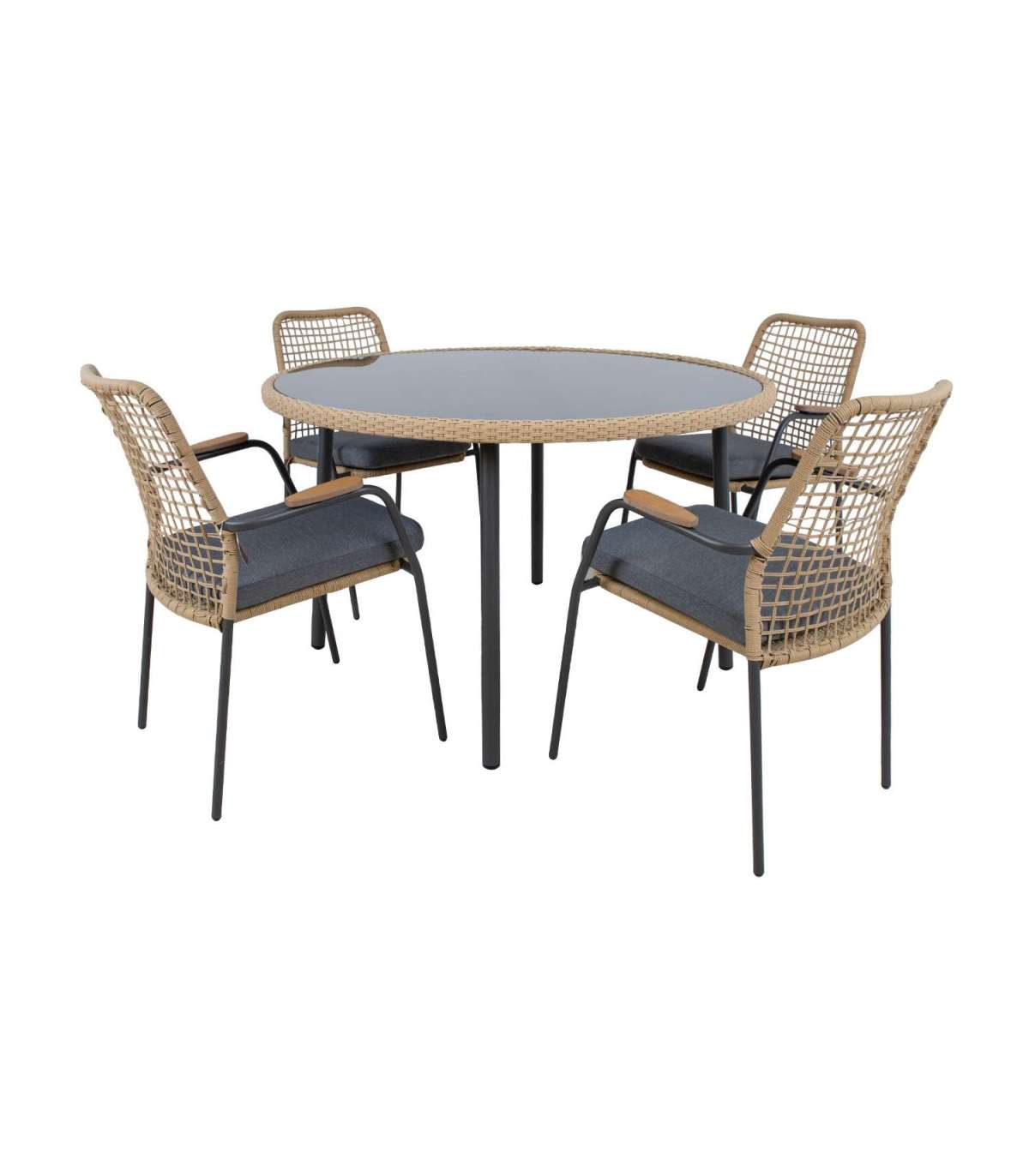Комплект садовой мебели PRUSSIA стол и 4 стула. Размеры стола D120xH74см. Столешница: темно-серое закаленное стекло. Каркас и ножки стола и стульев изготовлены из стали и покрыты порошковой краской темно-серого цвета. Край столика декорирован пластиковой тесьмой бежевого цвета. Сиденье и спинка стула обтянуты пластиковой оплёткой, напоминающей натуральный ротанг. Подлокотники кресла имеют ламели из искусственного дерева цвета тикового дерева. В комплекте подушки для сидения. Чехлы на подушки изготовлены из полиэстера серого цвета. Стулья штабелируются. Ограничение по весу 100 кг. Изделие устойчиво к переменчивым погодным условиям и очень простое в уходе, только подушки нуждаются в защите от непогоды. Чтобы продлить срок службы садовой мебели, мы рекомендуем использовать чехлы для садовой мебели. ХРАНЕНИЕ: в конце летнего сезона мы рекомендуем хранить садовую мебель в помещении. Очистите и высушите мебель перед хранением. Для хранения используйте сухое, хорошо проветриваемое помещение.
