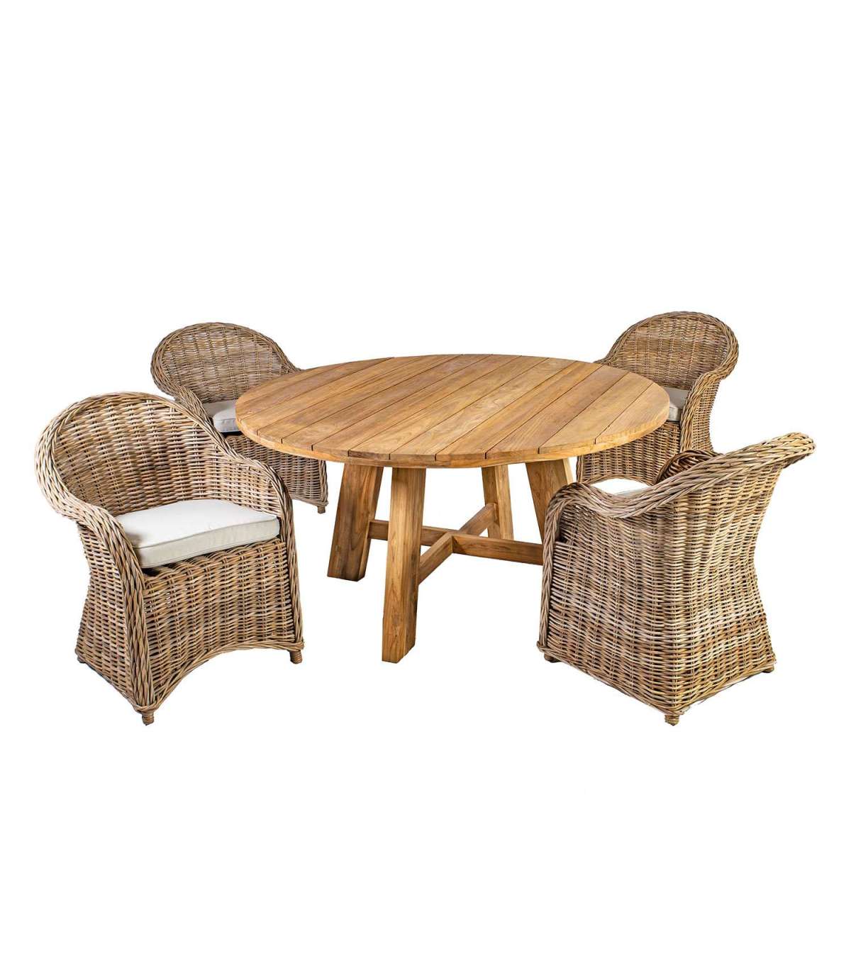 Стол D150xH78см, материал: массива древесины тика повторного использования, цвет: натуральный. Кресло с подушкой 63x66xH85см, рама из ротанга с натуральным плетением из ротанг, цвет: серый.