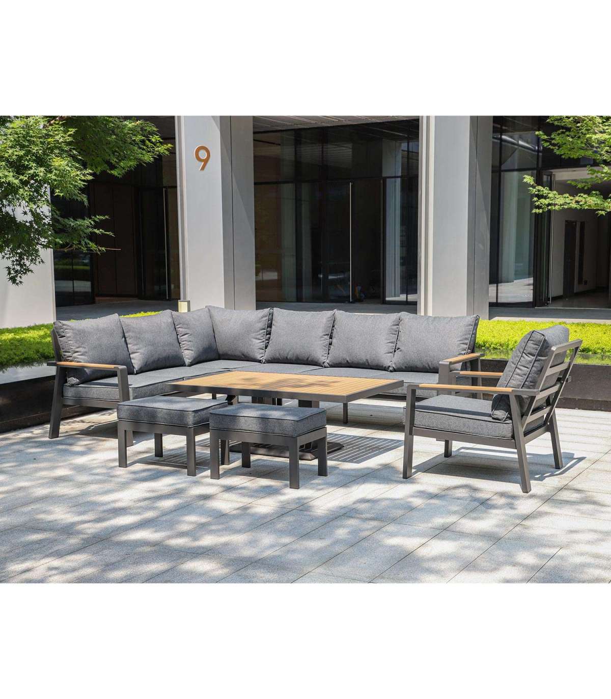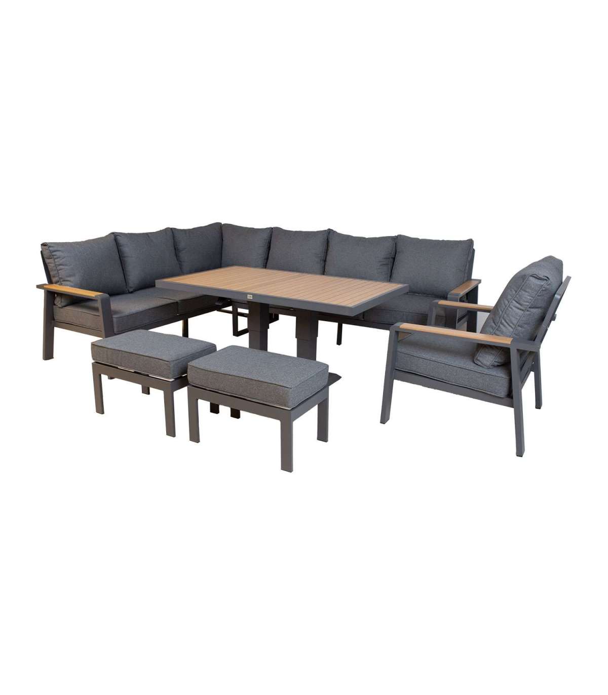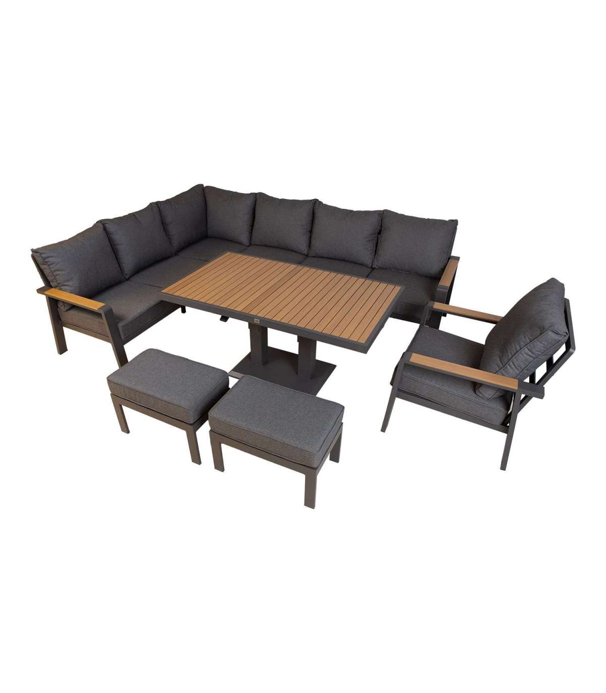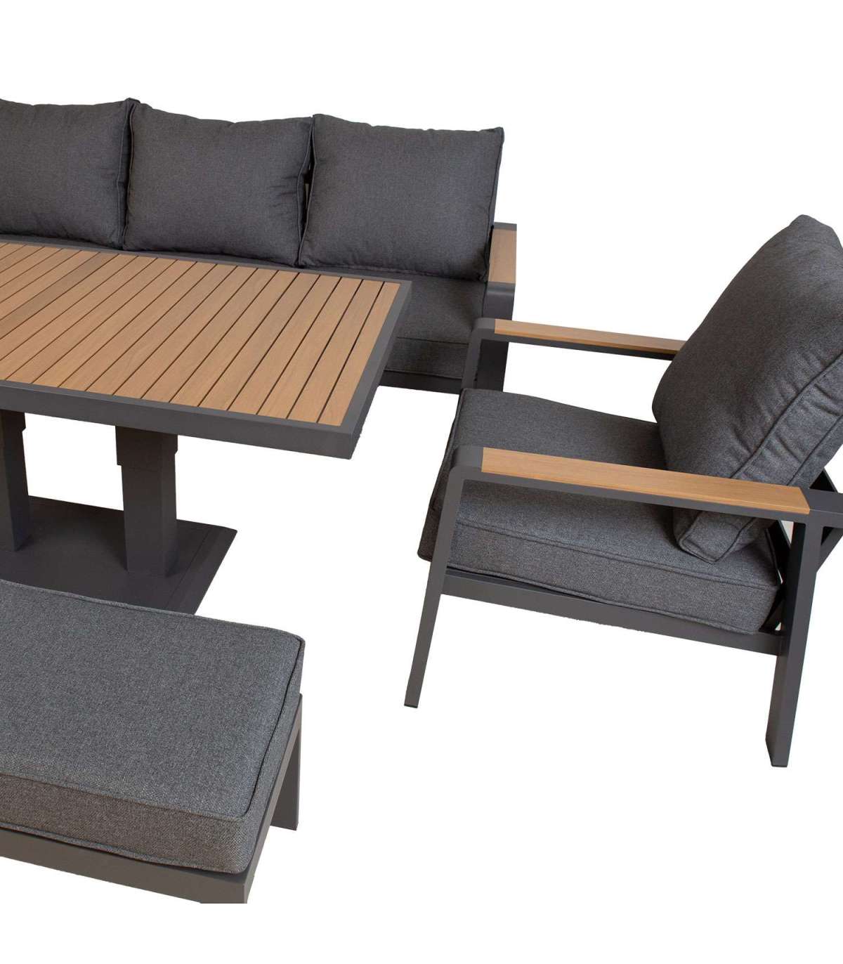 Komplekti kuulub muudetava kõrgusega laud, nurgadiivan, tugitool ja 2 tumbat. Komplekti kõigi osade raamid on valmistatud alumiiniumist ja viimistletud halli pulbervärviga. Lauaplaadi ja tooli käetugede naturaalse puidusüü tekstuuri meenutav pinnaviimistlus on saavutatud soojusülekande printimise meetodil. Puidu tekstuuri ülekandmiseks alumiiniumpinnale asetatakse ülekandekile alumiiniumprofiili peale ja seejärel allutatakse kõrgele kuumusele. Protsessi käigus viiakse tint ülekandekilelt alumiiniumpinnale, luues puidutaolise efekti. Sel viisil viimistletud pind on väga vastupidav ja talub hästi nii päikesekiirgust, kui kergemaid kriimustusi.